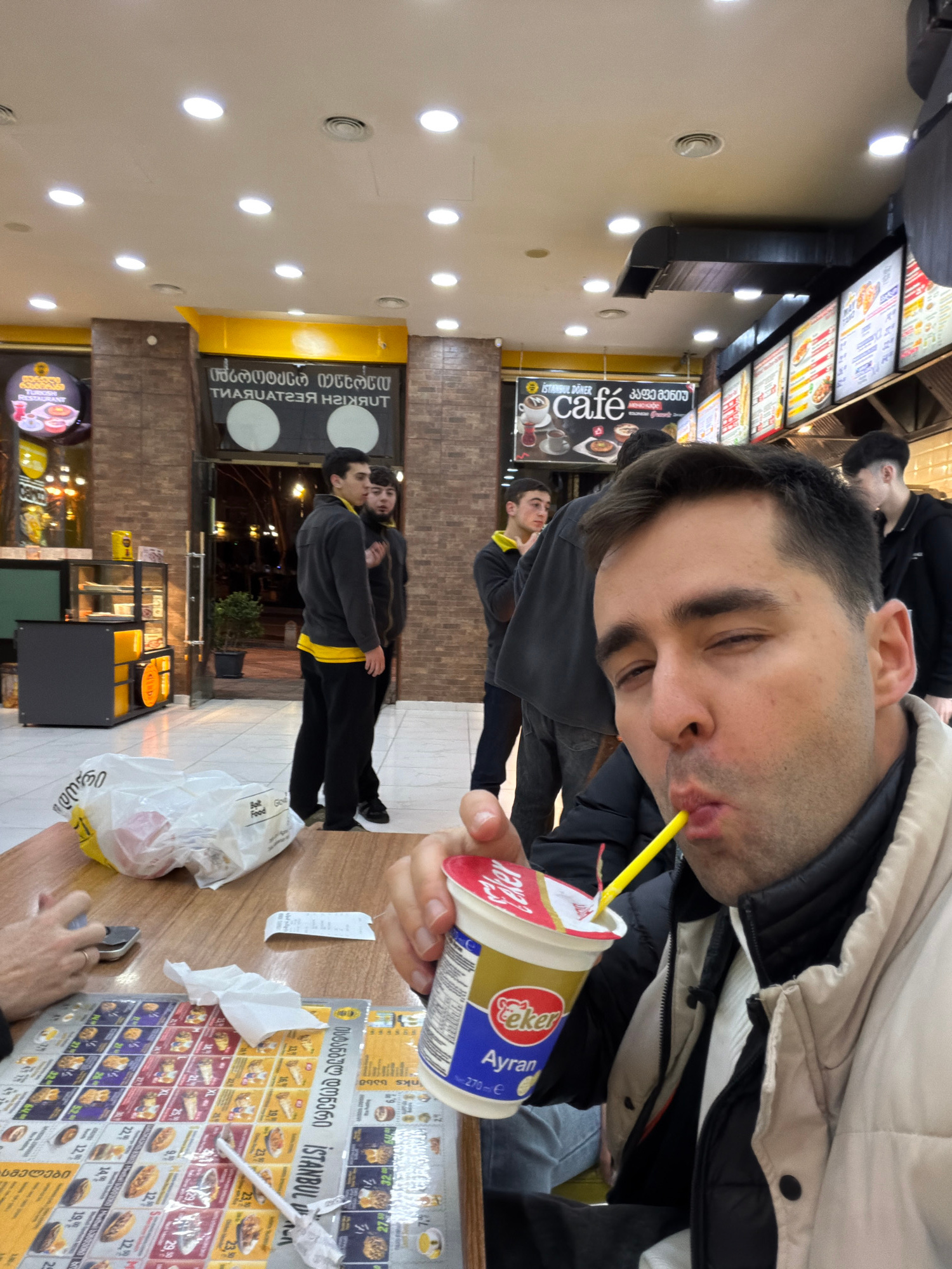 The image depicts the interior of a Turkish fast-food establishment in Tbilisi, Georgia, at night. In the foreground, a male with short dark hair, wearing a beige puffer jacket over a black one, looks…read more