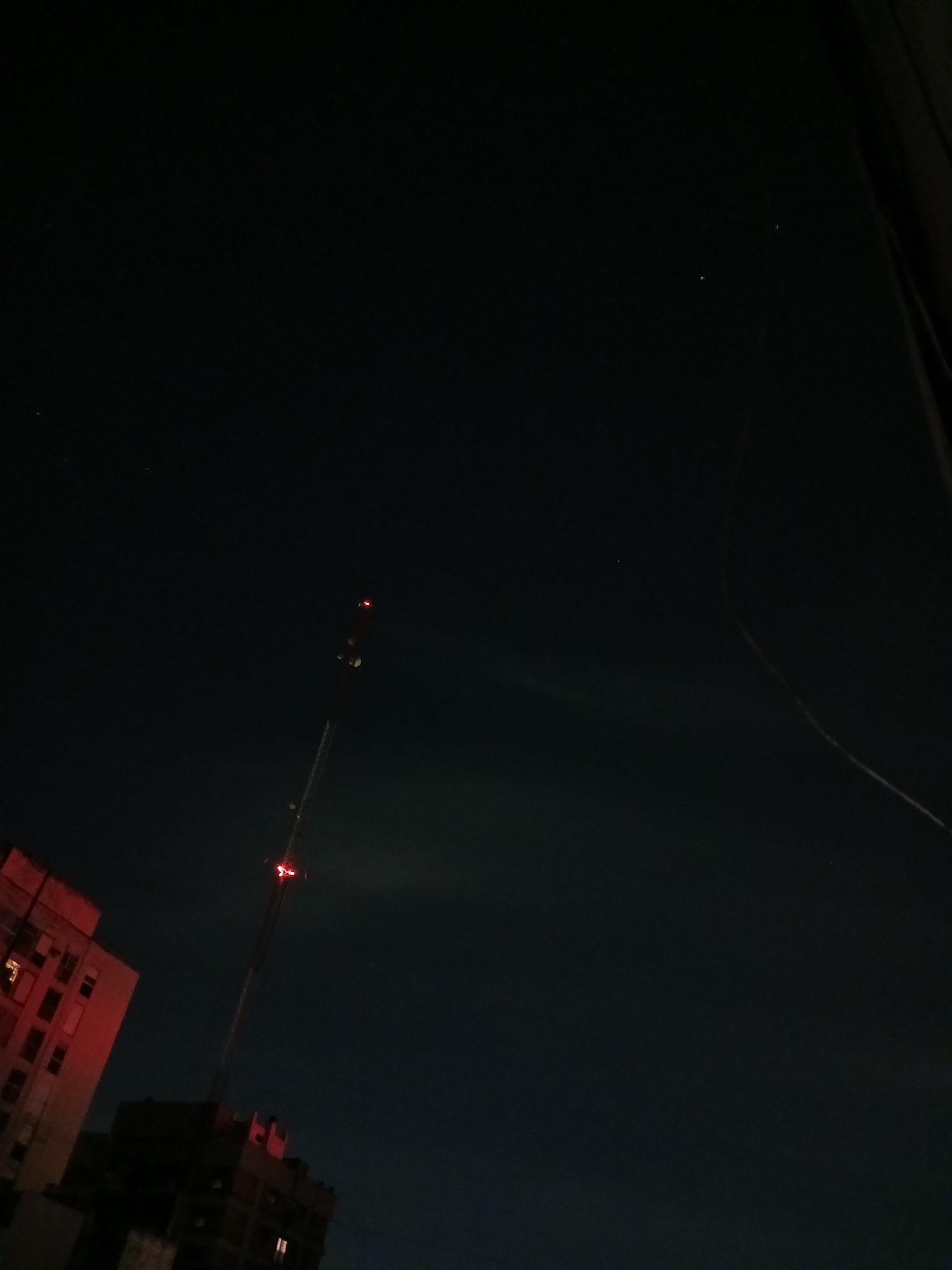 The image shows a nighttime scene with a dark sky and several buildings illuminated by red and white lights. In the lower right corner are two buildings, one appearing with red-tinted windows and the…read more
