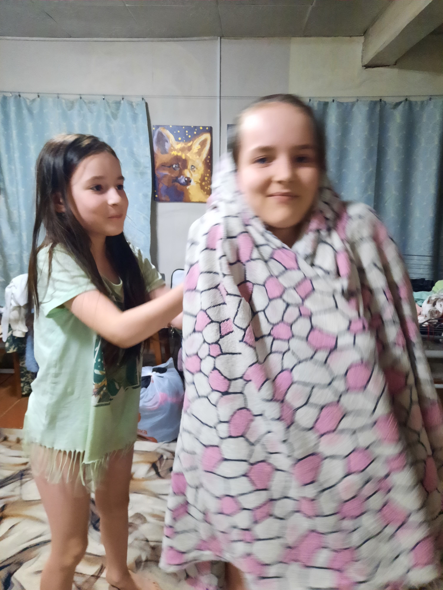 Two girls are depicted indoors. One girl is standing and wearing a light green t-shirt. The other girl is wrapped in a patterned blanket with pink and white designs. The setting appears to be a bedroo…read more
