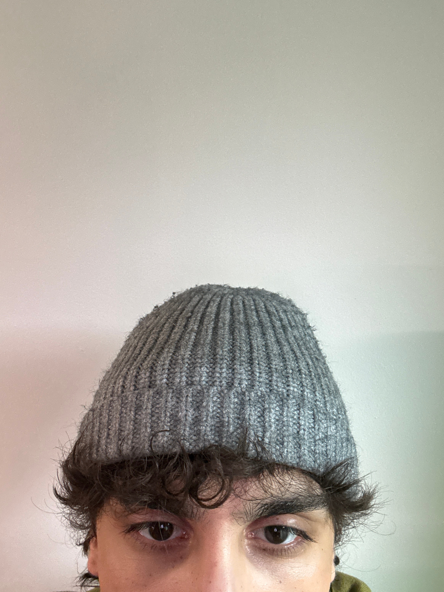 The image shows a close-up of a person's face, rotated sideways. The person is wearing a grey knitted beanie. Visible features include dark curly hair peeking out from under the beanie, two eyes with…read more
