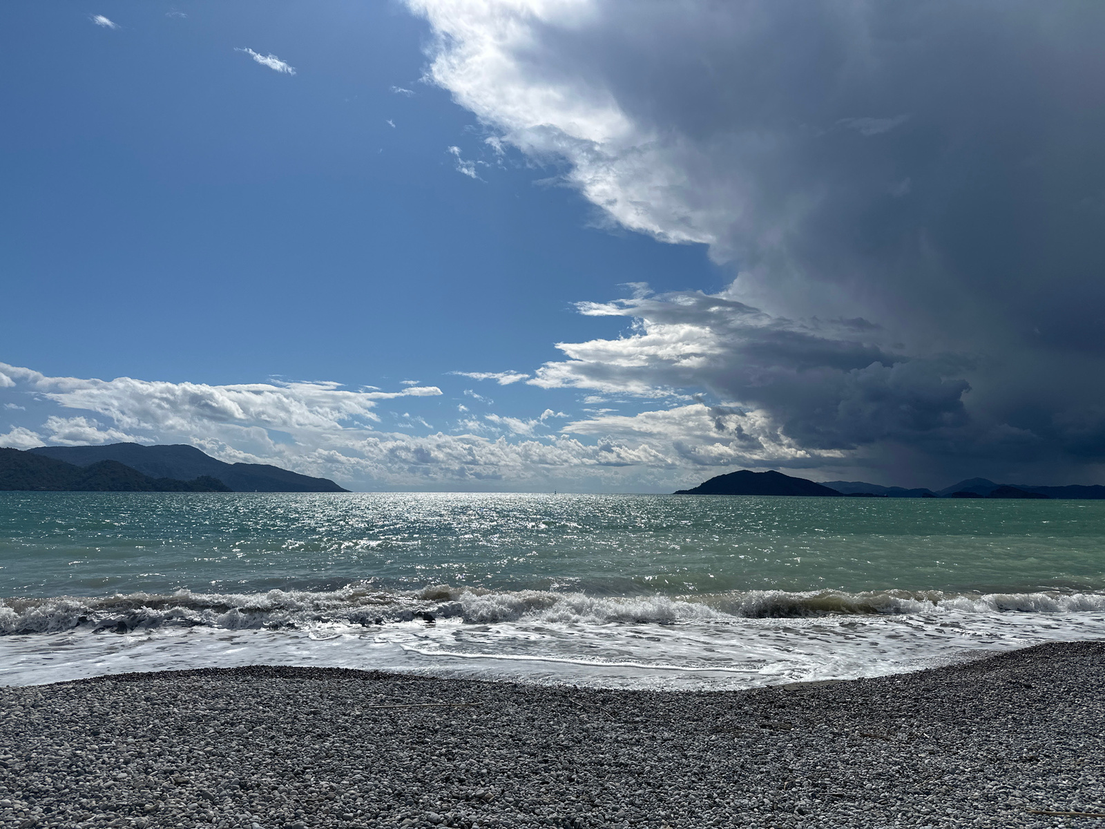 This image shows a pebble beach in Fethiye, Turkey. The foreground is filled with small, smooth gray pebbles. Beyond the pebbles are waves breaking on the shore, creating white foam. The water is turq…read more