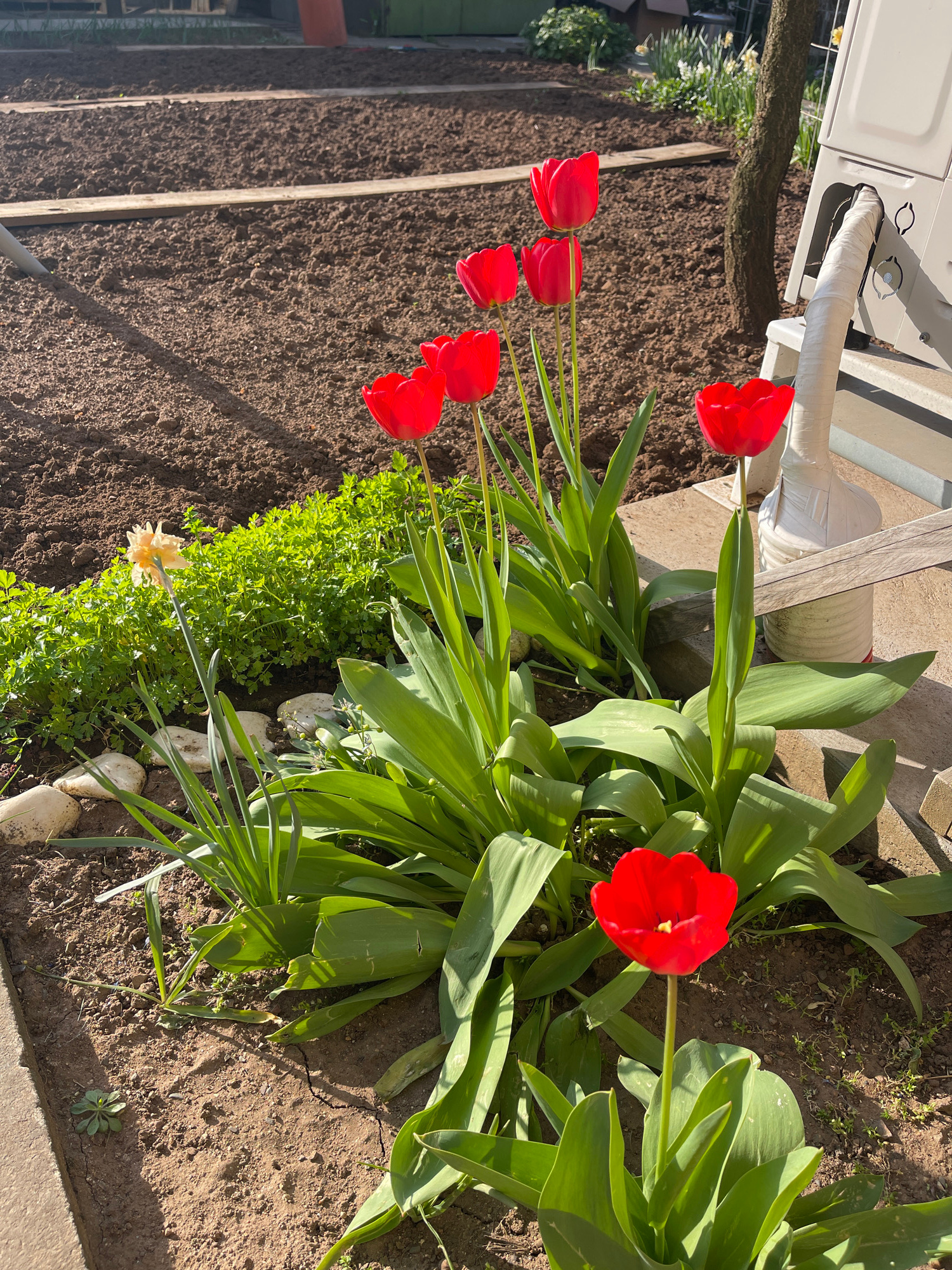 The image displays a vibrant outdoor garden scene, likely a residential backyard in Sofia, Bulgaria, under bright daylight. The main subjects are several vivid red tulips with long, broad green leaves…read more
