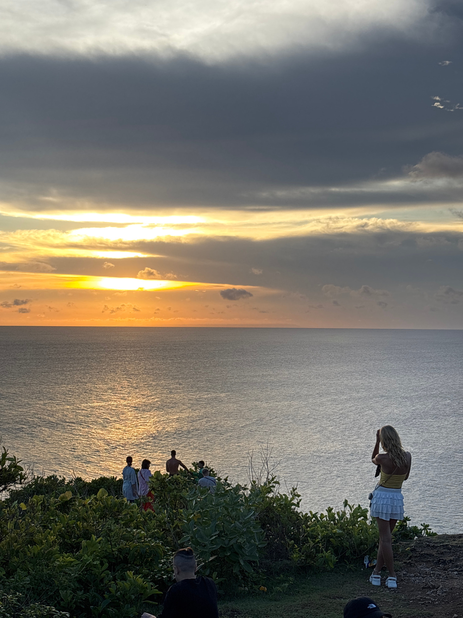 The image shows a cliffside view at sunset in Uluwatu, Indonesia. The left side of the image shows a sky with dark and light clouds illuminated by a vibrant orange and yellow sunset. To the right of t…read more