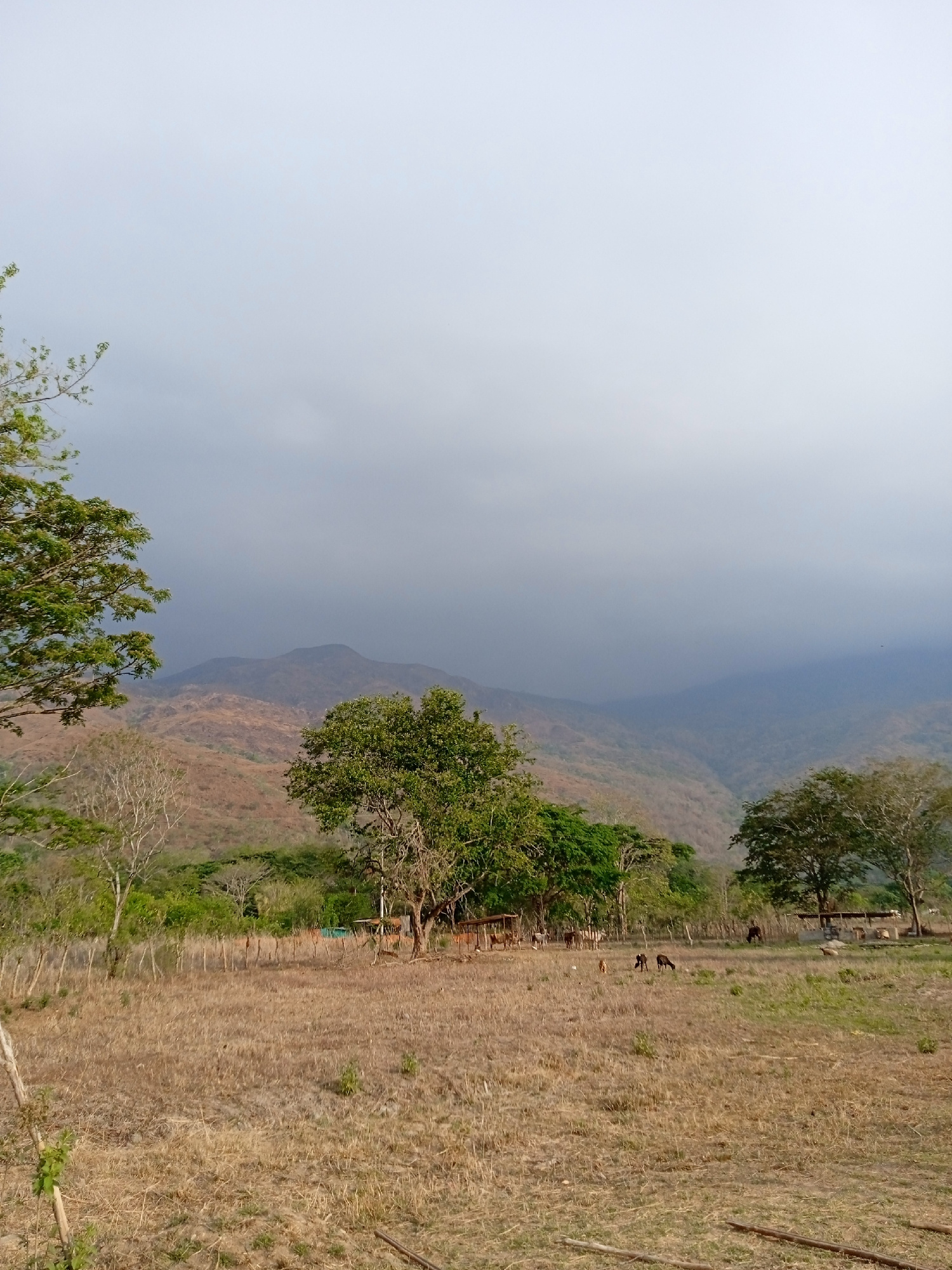 The image depicts a rural landscape in Montalbán, Venezuela. In the foreground, a field of dry, brown grass dominates the scene. Several trees are scattered throughout, some with green foliage and oth…read more