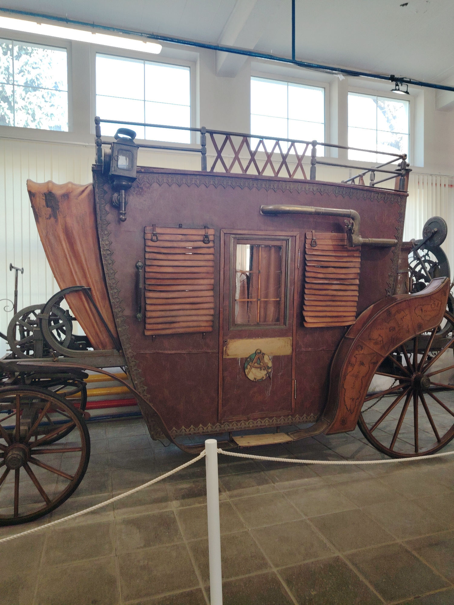 This media file captures a detailed view of a large, antique-style carriage or stagecoach, displayed indoors, likely in a museum or exhibition hall in Moscow, Russia. The carriage itself is the centr…read more