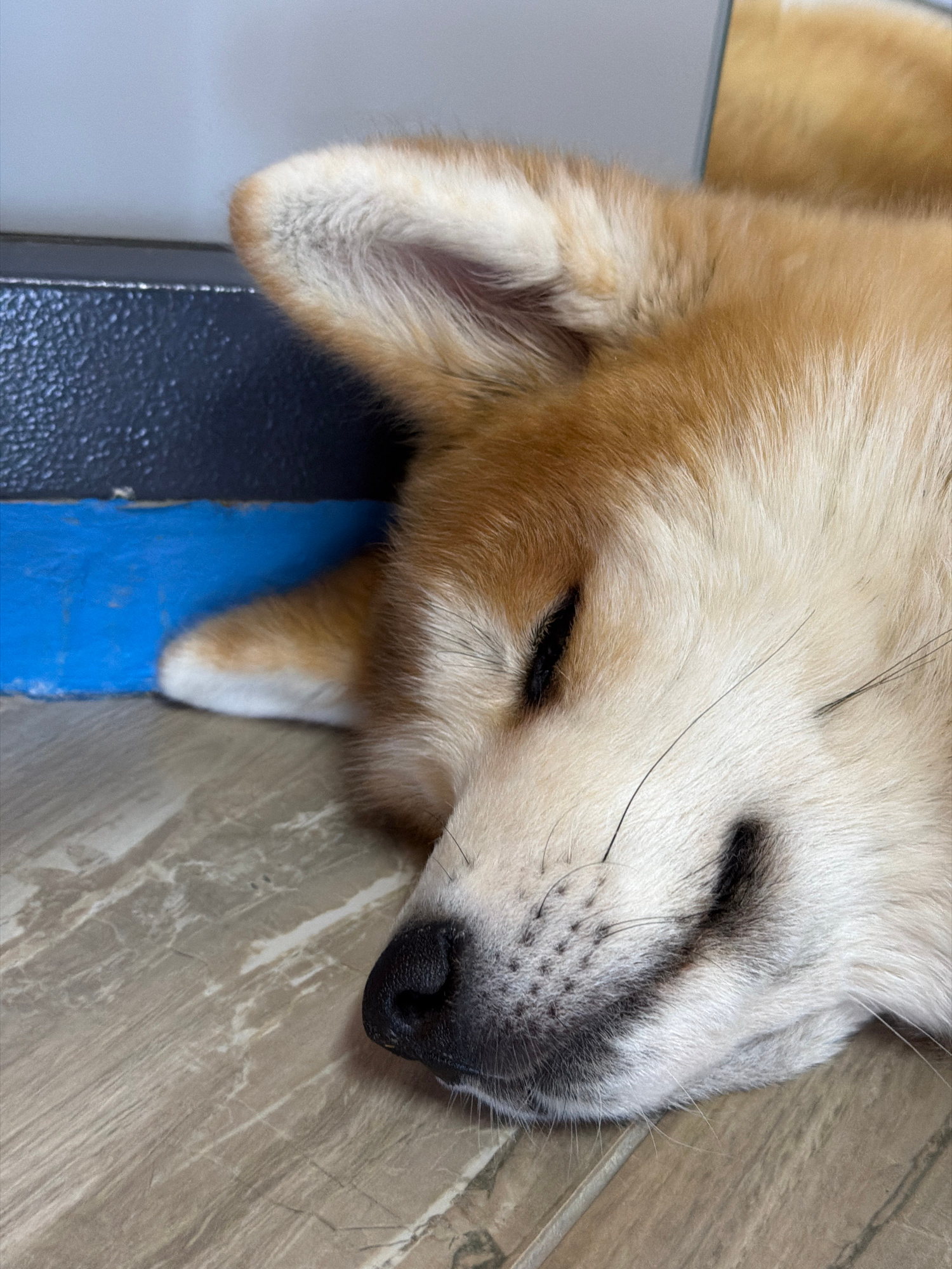A close-up, high-angle shot captures a peaceful sleeping dog, possibly a Shiba Inu or similar breed, resting indoors. The dog's head is the primary subject, oriented upside down in the frame, with its…read more