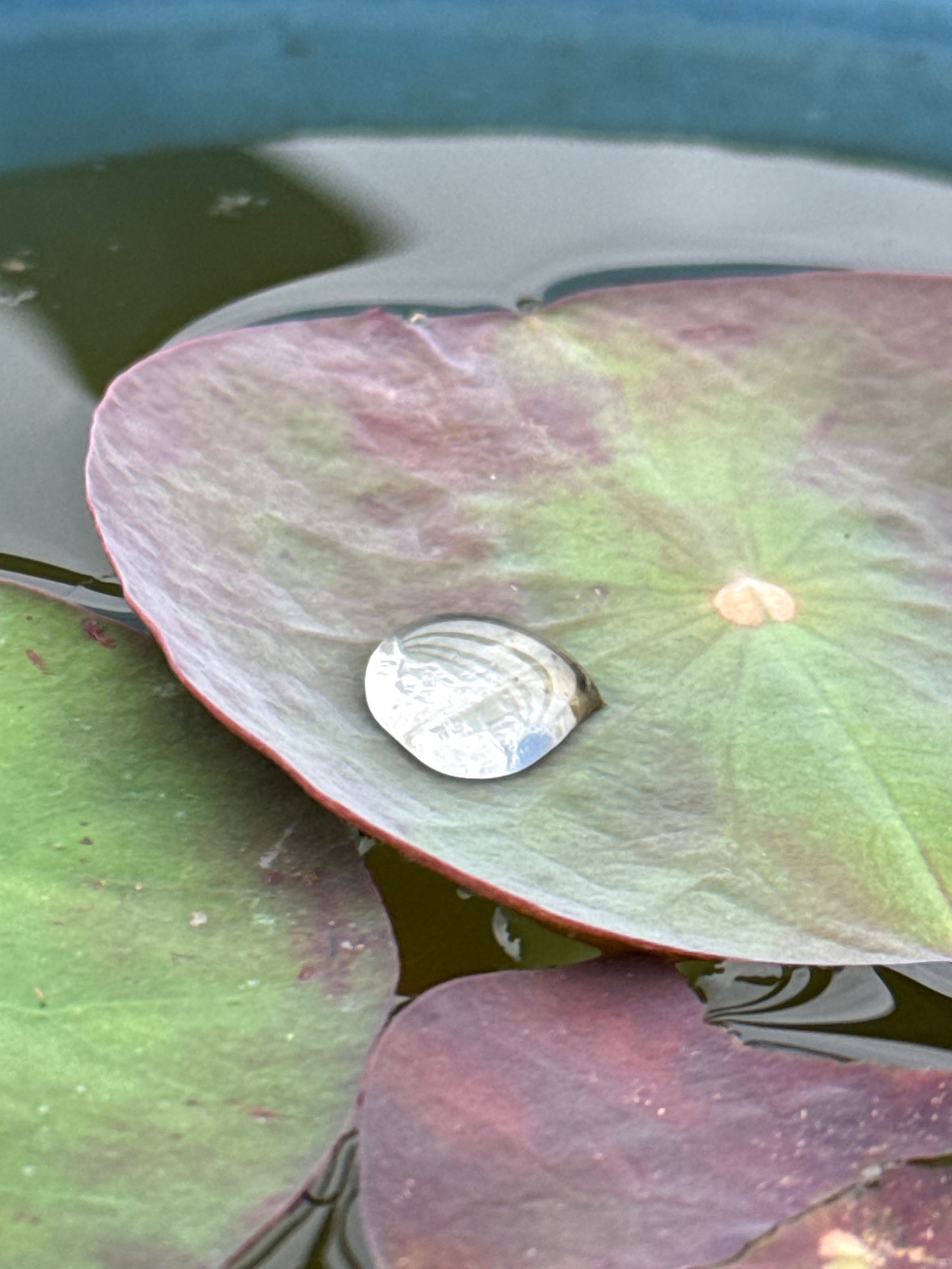 The image shows a close-up view of several lily pads floating in a body of water. A clear, circular water droplet rests on the surface of a lily pad. The pads vary in color, with some exhibiting green…read more