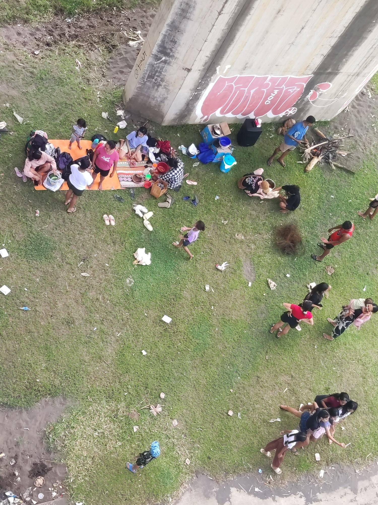 The image, taken from an elevated perspective, depicts a group of people gathered in a grassy area adjacent to a concrete structure bearing graffiti, likely a bridge support. A group is sitting on a b…read more