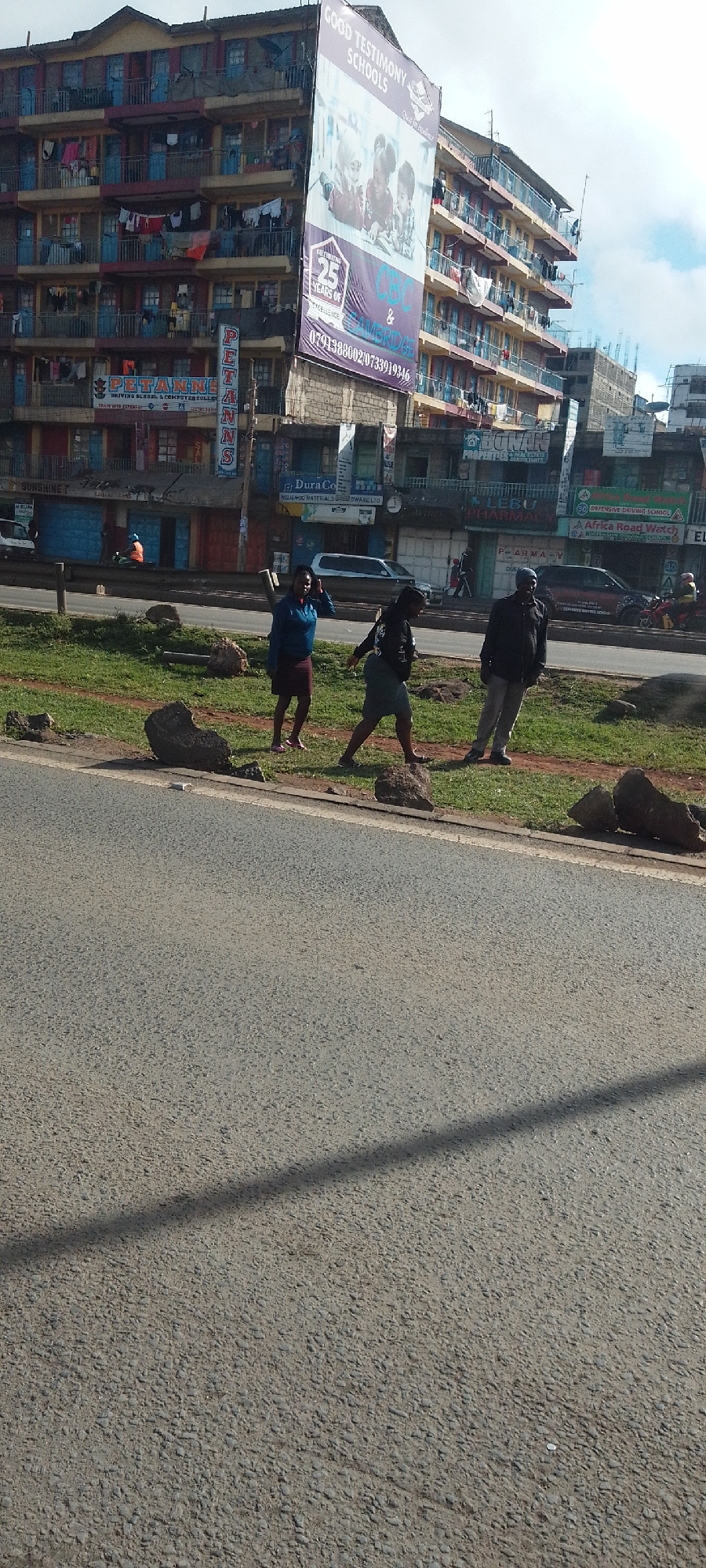 The image depicts an urban street scene in Nairobi, Kenya, showcasing a multi-lane road flanked by densely packed multi-story buildings. In the foreground, a gray asphalt road surface occupies the low…read more