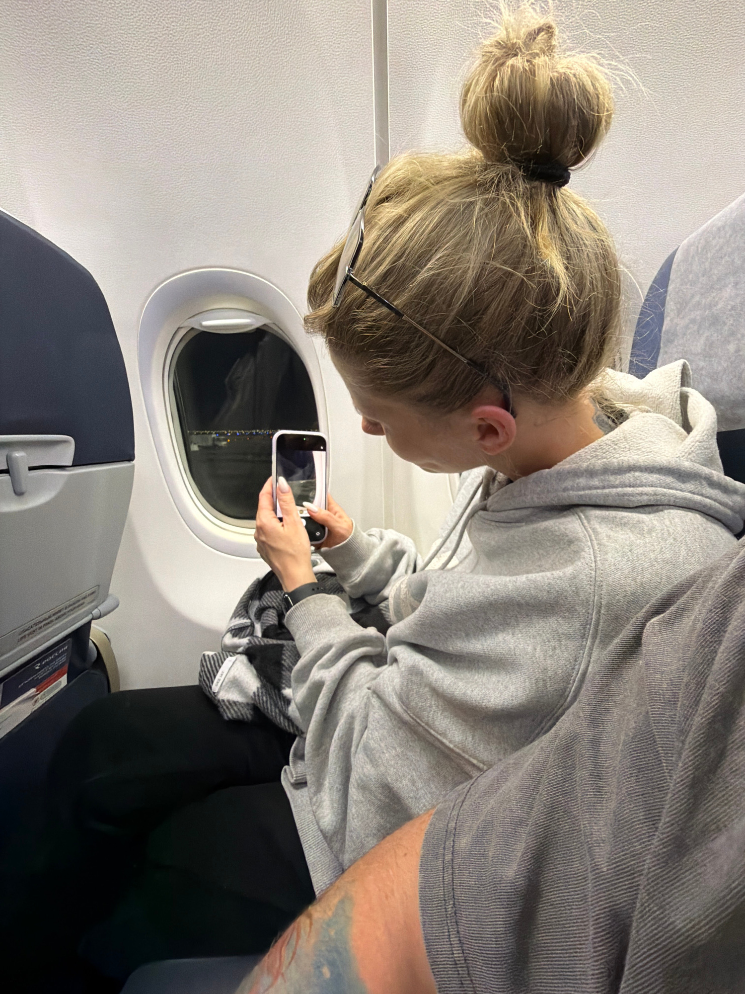 The image shows a woman with blonde hair in a bun, wearing glasses and a gray hoodie, sitting on an airplane and taking a picture of the view outside the window with her phone. The plane's interior is…read more