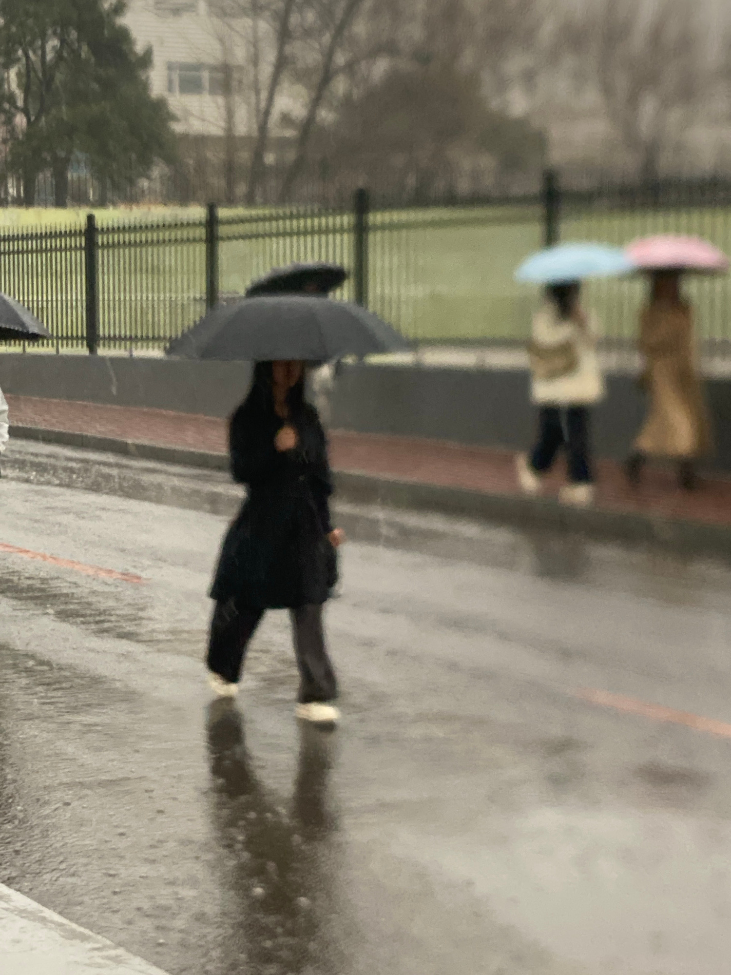 The image shows a wet, paved surface, likely a street or courtyard, with several people visible. In the foreground, an individual wearing a dark coat and dark pants, with white shoes, is walking while…read more