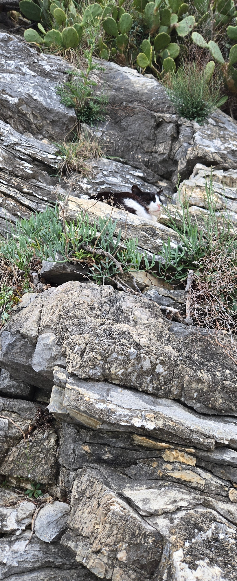 A close-up shot, rotated 90 degrees counter-clockwise, reveals a rocky terrain with vegetation. A young goat, with black and white fur, is nestled between the rocks. The rocks are predominantly grey a…read more