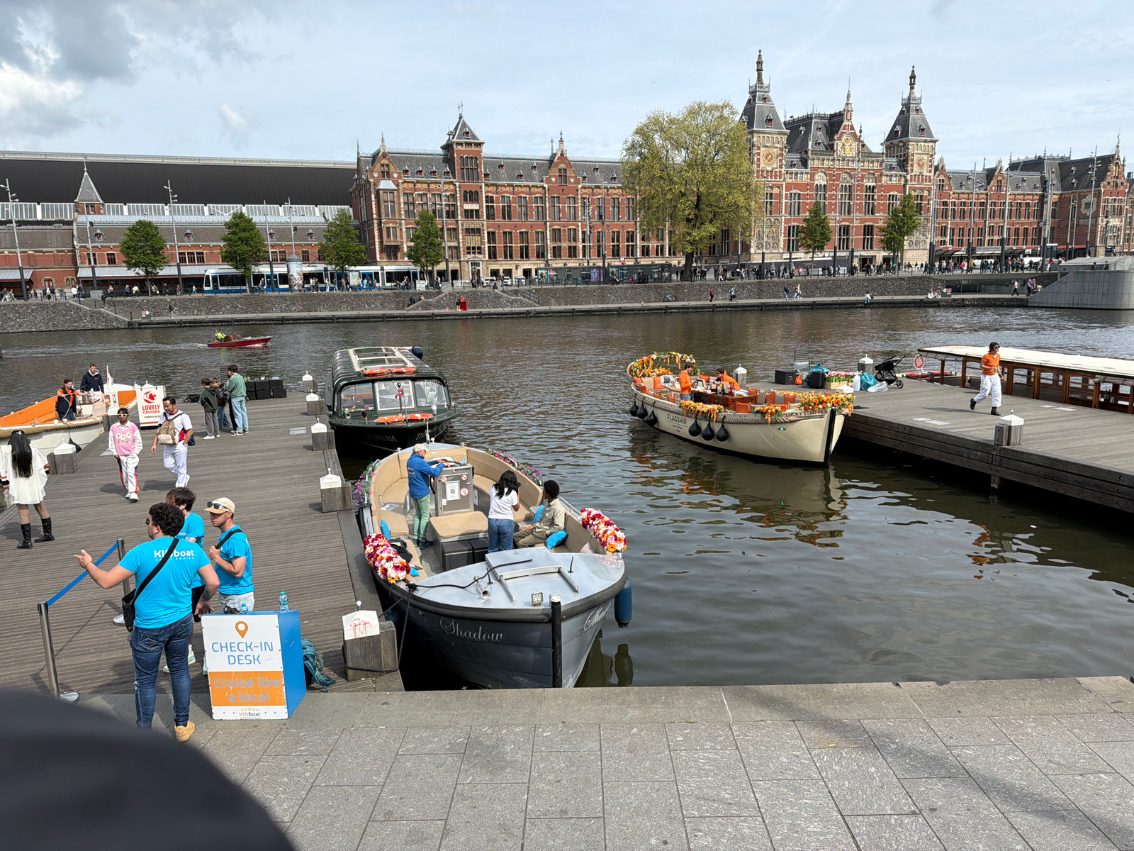 This image captures a lively canal scene in Amsterdam, Netherlands, with the prominent architecture of Centraal Station dominating the background. The sky is overcast, indicating a cloudy daytime sett…read more