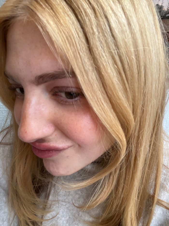 A close-up portrait shows a woman with blonde hair. Her face is tilted slightly to the side, revealing a profile view of her nose and lips. She has fair skin and light eyebrows. One eye is visible, di…read more