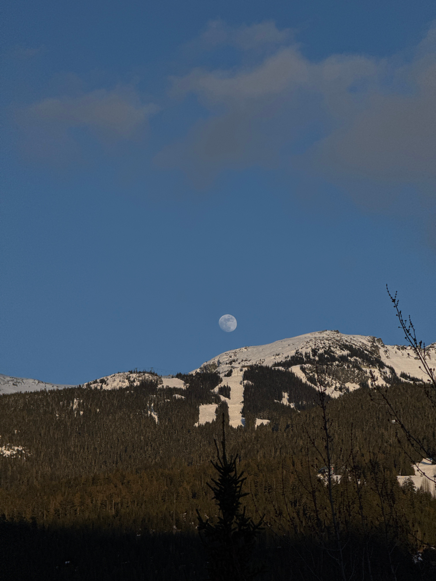 The image shows a landscape with a clear blue sky, a bright moon, and a mountain range covered with snow and trees. The mountain range takes up the right half of the frame, with varying tones of white…read more