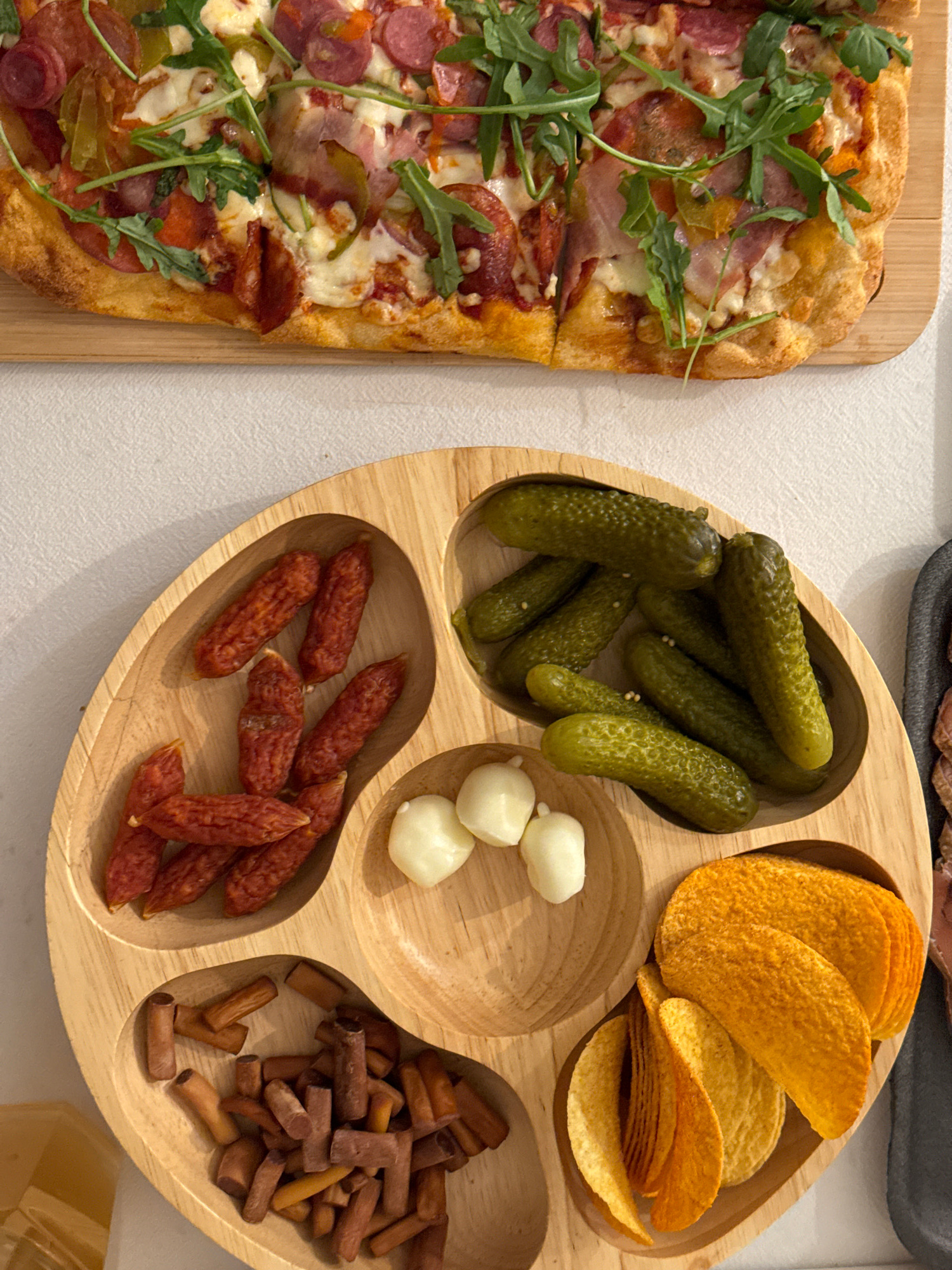 The image shows a spread of food on a table, likely for a casual gathering. On the left is a rectangular pizza on a wooden cutting board, topped with pepperoni, ham, cheese, and arugula. Adjacent to t…read more