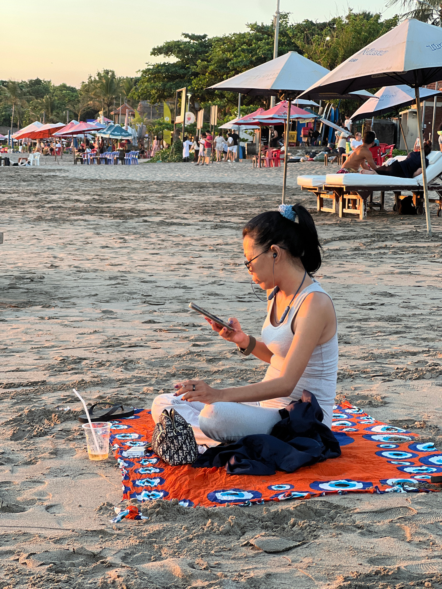The image, captured on a sandy beach in Kuta, Indonesia, depicts a lively late afternoon or early evening scene. In the foreground, a woman with dark hair pulled back, wearing glasses, a light grey ta…read more