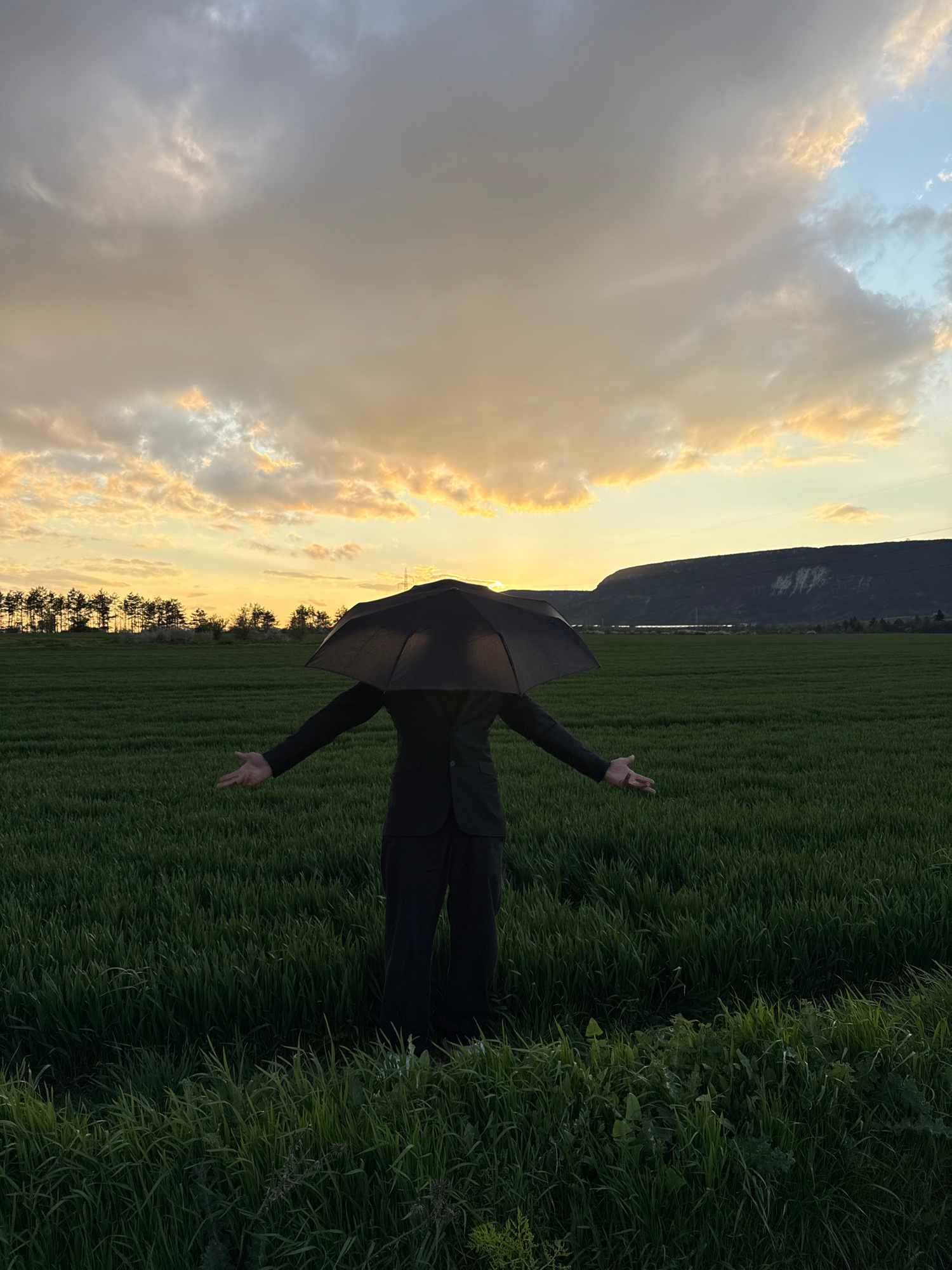 A person dressed in black clothing stands in a green field, holding an umbrella, with arms outstretched. The scene appears to be at sunset or sunrise. In the background, there are some trees, a mounta…read more