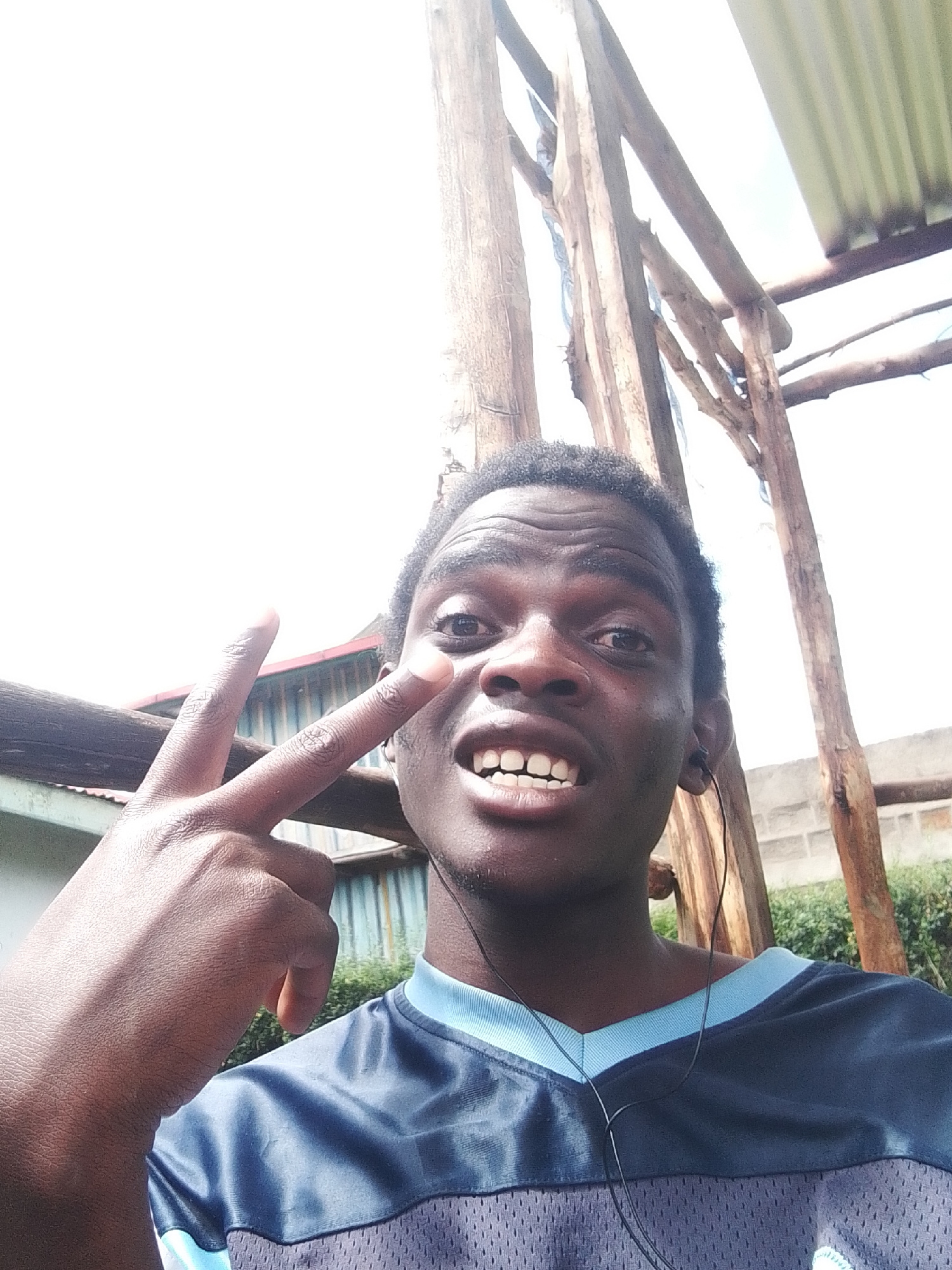 A dark-skinned man is standing outdoors, making a peace sign. He is wearing a dark blue and gray v-neck shirt with light blue trim, and has earphones in his ears. Behind him is a wooden structure, fol…read more