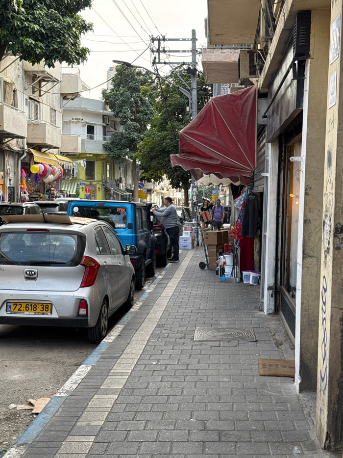 The image depicts an urban street scene in Tel-Aviv, Israel, on an overcast day. A paved sidewalk occupies the right foreground, bordered by a street marked with blue and white curb paint. A silver Kia Picanto, bearing Israeli license plate "72:618:38," is parked closest to the viewer on the street, with cardboard on its roof. Immediately behind it is a blue Jeep Wrangler, with a "FOX" decal on its rear window. A man in a grey long-sleeved shirt is standing beside the driver's side of the Jeep, appearing to attend to something inside or on the vehicle. To the right, a storefront features a partially folded red fabric awning. Merchandise, including cardboard boxes stacked on a green hand truck, paint buckets, and various items, is displayed on the sidewalk outside the shop. A brown doormat rests near the entrance. Further down the sidewalk, two pedestrians, a woman in a black top and shorts carrying a bag, and a man in a purple shirt with a shoulder bag, are walking away from the camera. Buildings with multiple stories line both sides of the street, exhibiting a somewhat worn appearance. Overhead utility wires and a street light pole are visible against the cloudy sky. Further down the street on the left, another shop displays colorful balloons and other items outdoors. Graffiti is present on a concrete pillar in the far right foreground, and a circular patterned manhole cover is set into the sidewalk. | Open Wire