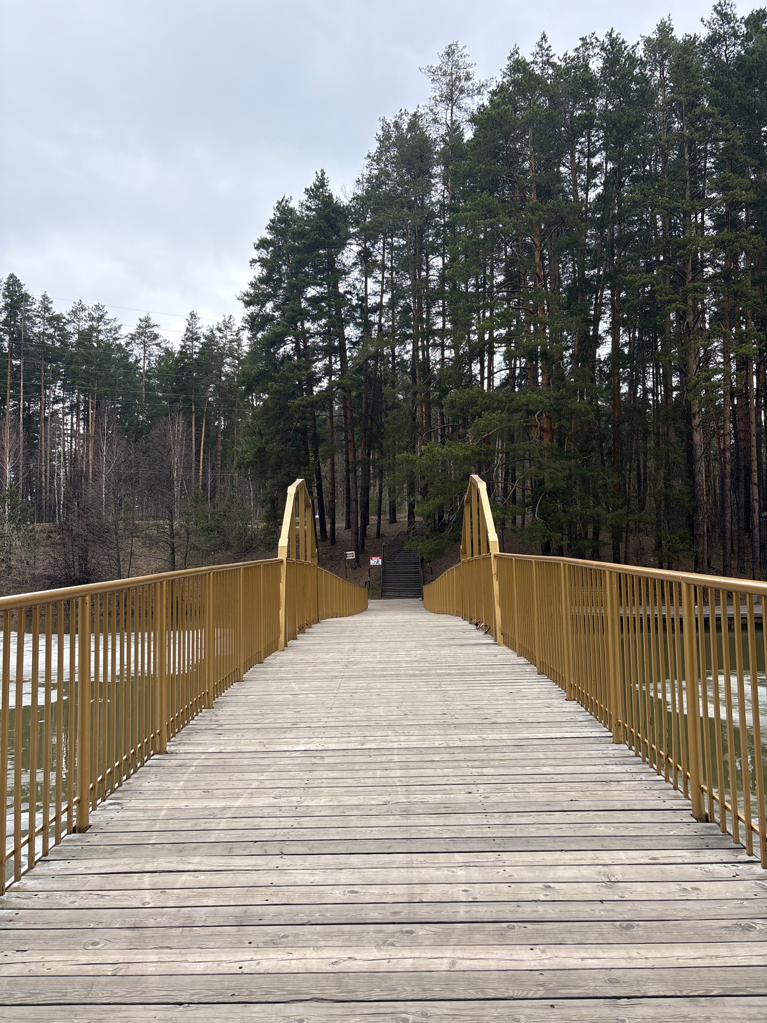 The image captures a wooden pedestrian bridge located in Neftekamsk, Russia. The bridge's walkway is constructed of light-gray wooden planks, and it features golden-colored metal railings on both side…read more