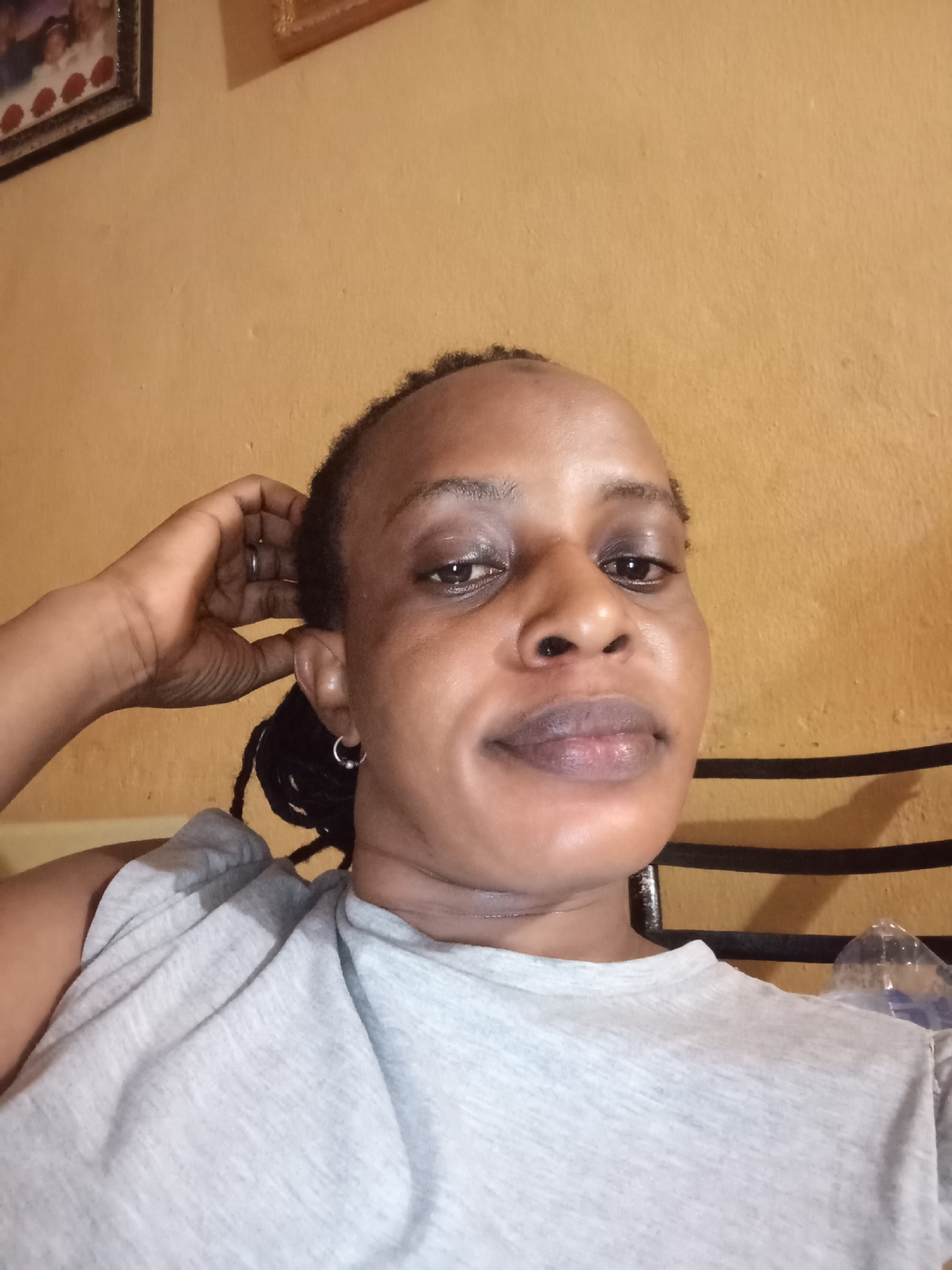 A woman with dark skin and dark hair in braids sits against a light yellow wall. She wears a gray t-shirt. Her left hand is raised to the back of her head. She has a small silver earring in her left eā¦read more