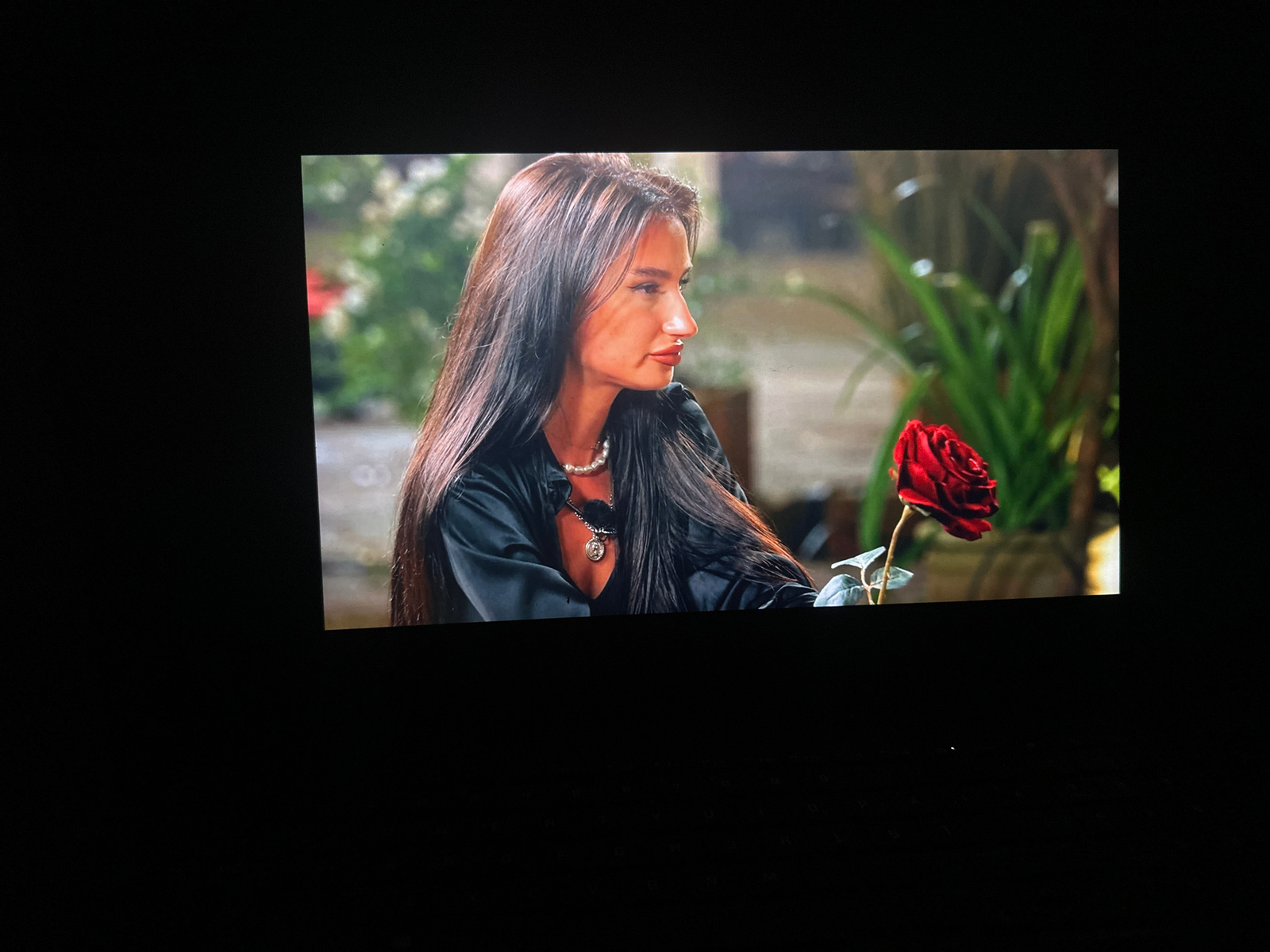 The image is a still from a video or television show. A woman with long, dark hair is sitting with a red rose in the foreground. She is wearing a black satin top and a pearl necklace. She also has a medallion around her neck. The background is blurry, but it appears to be a garden or outdoor setting. The video was recorded from a television screen, hence the dark background. The location is Kutsina, Bulgaria. | Open Wire