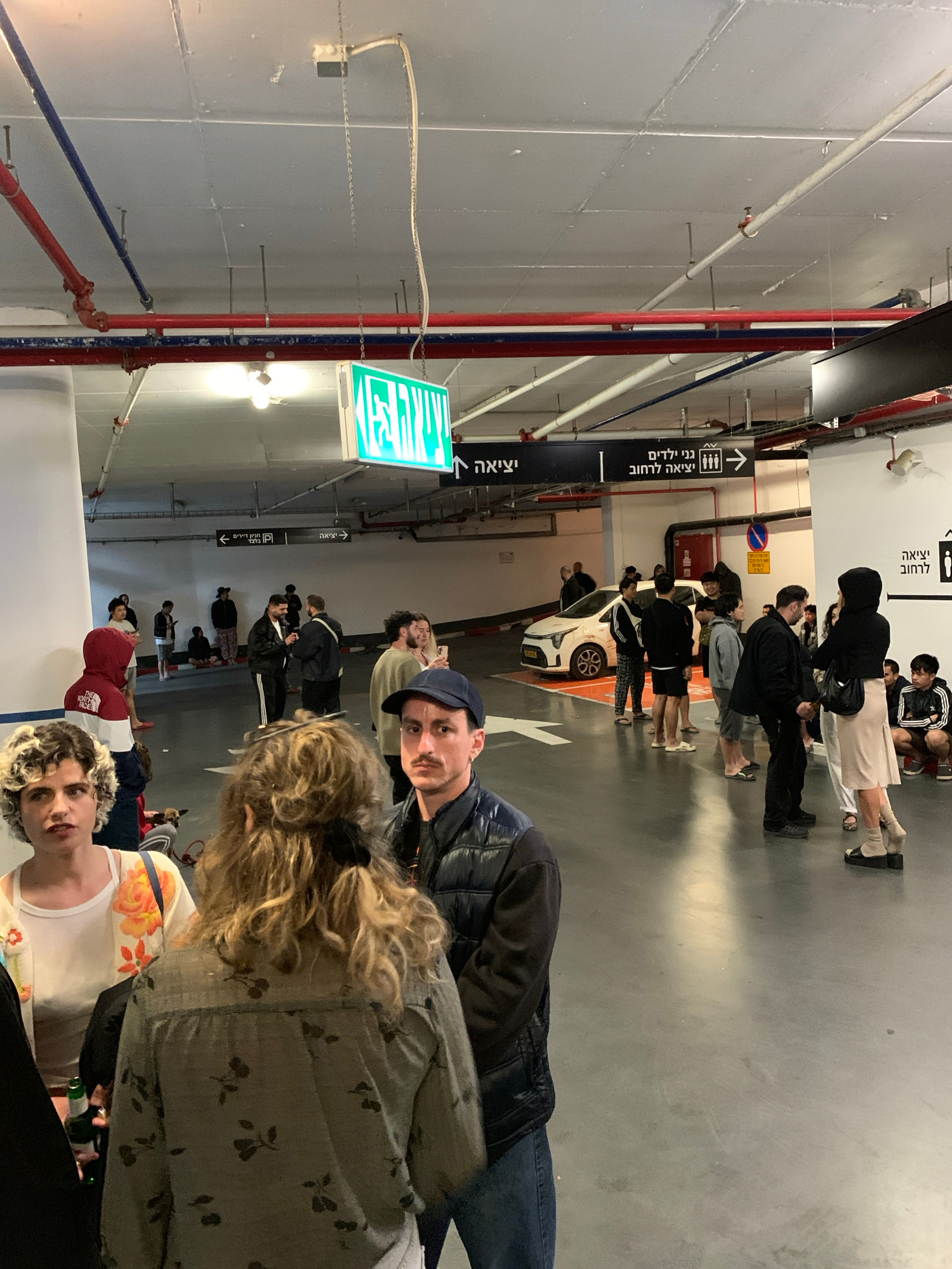 This image depicts an indoor parking garage in Tel-Aviv, Israel, with a group of people gathered. An emergency exit sign is visible overhead, along with various pipes and support structures. The peopl…read more
