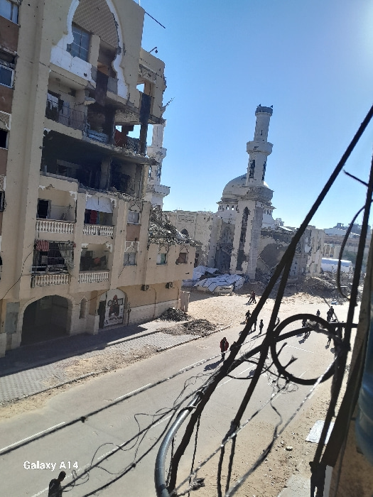 The image captures a scene of extensive destruction in an urban environment, likely in Khan Yunis, Palestinian Territory. In the foreground, several multi-story buildings are severely damaged, with la…read more