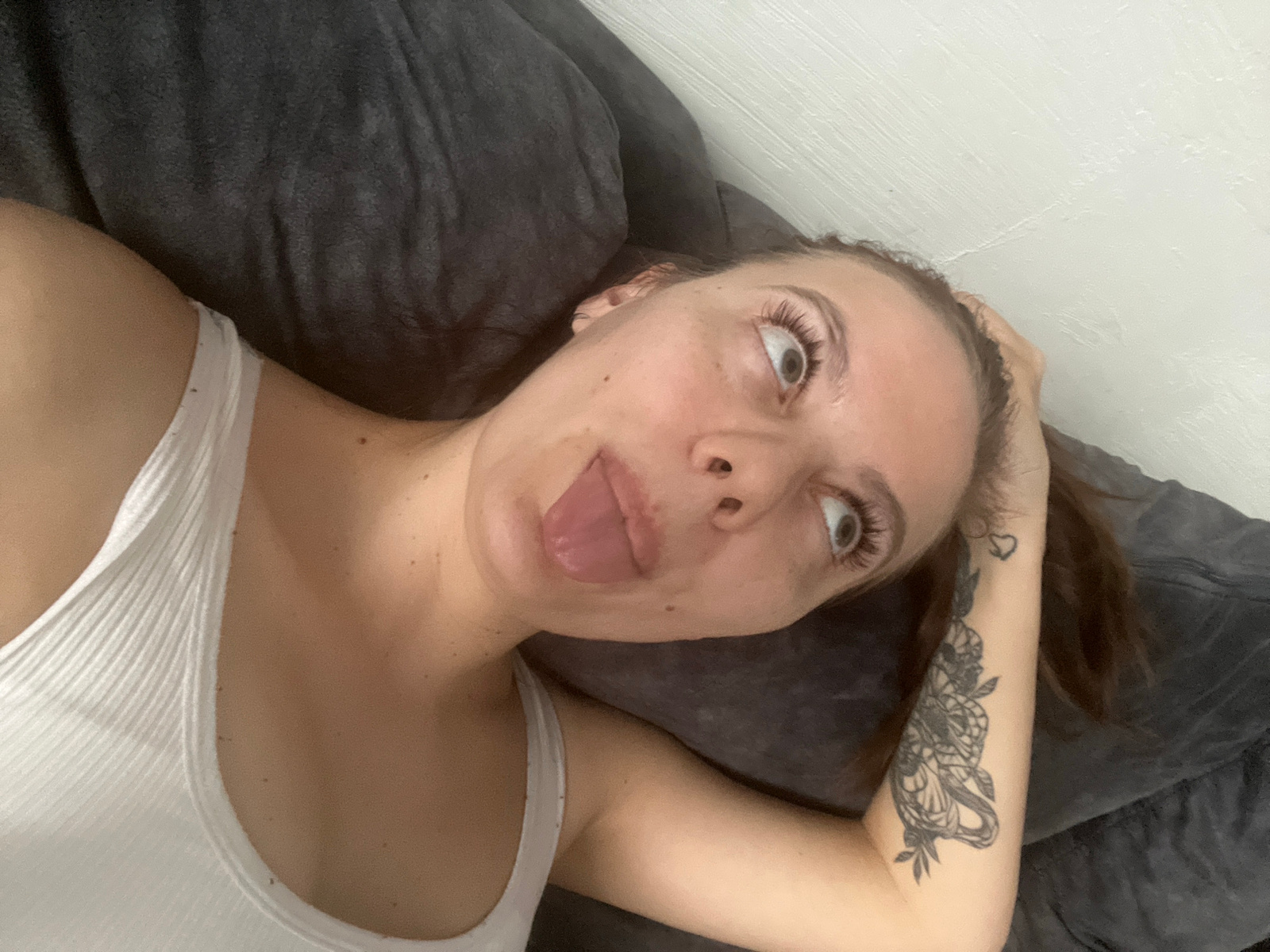 A woman lies supine on a gray cushioned surface, possibly a couch or bed. She wears a white ribbed tank top. Her left arm is raised, revealing a dark tattoo on her inner arm. Her hair appears dark bro…read more