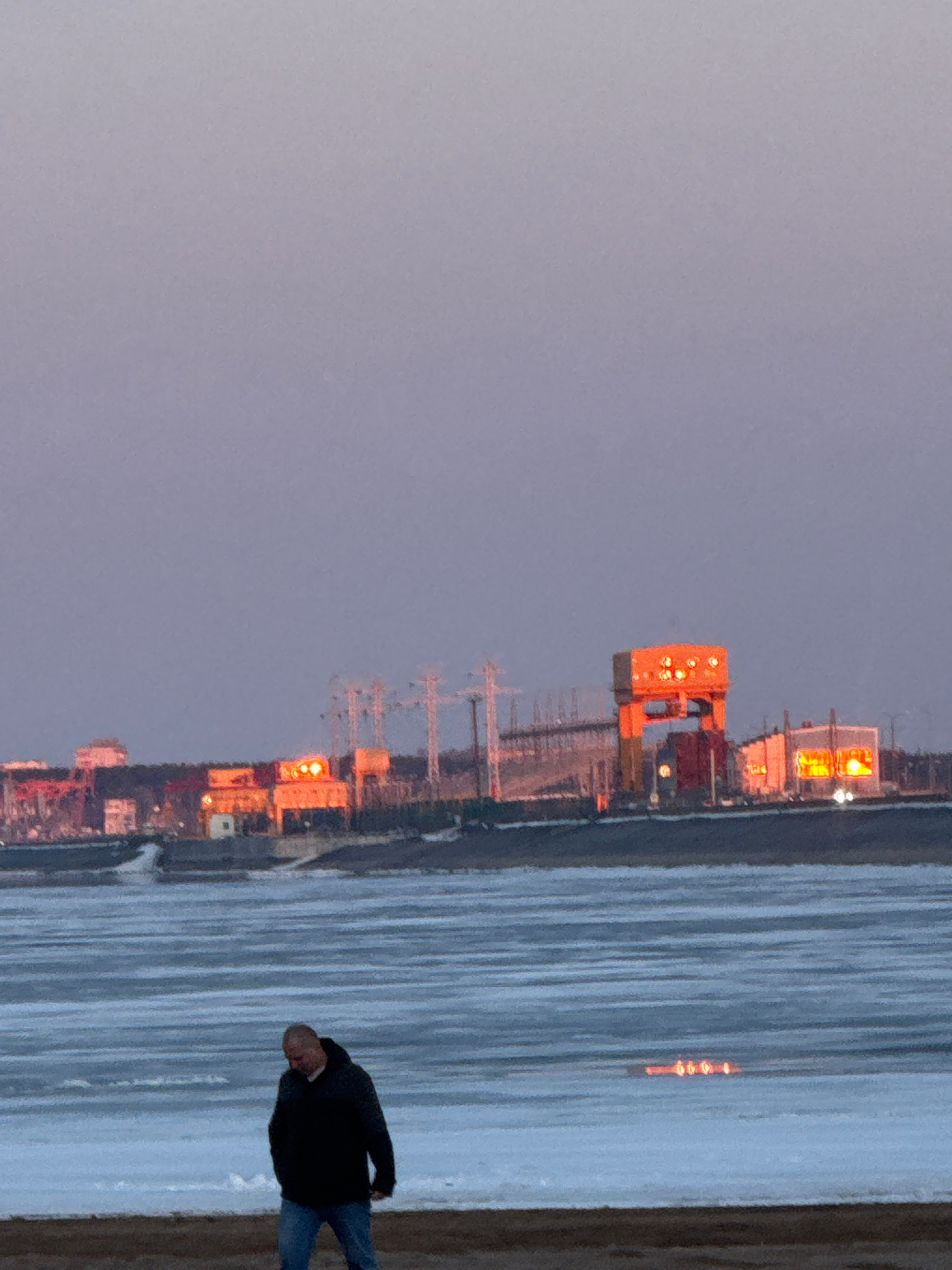 A long shot depicts a body of water, likely a river, adjacent to an industrial area in Noviy, Russia. The sky is overcast. In the foreground, a single male stands near the water's edge. He is wearing…read more