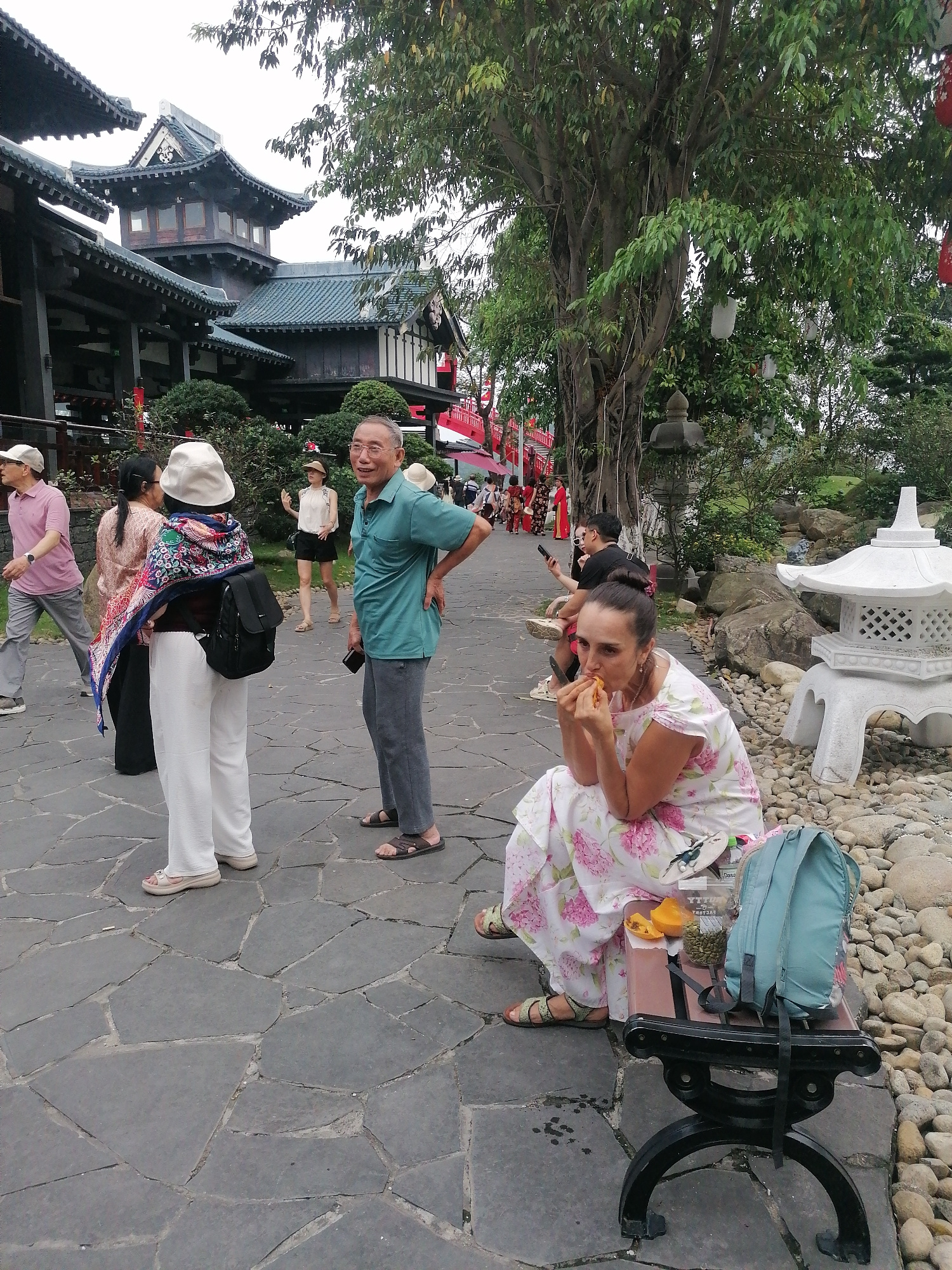 A woman is seated on a black bench in Hong Gai Ward, Vietnam. She is wearing a floral dress and sandals, and is eating a piece of fruit. A light blue backpack is leaning against the bench beside her.…read more