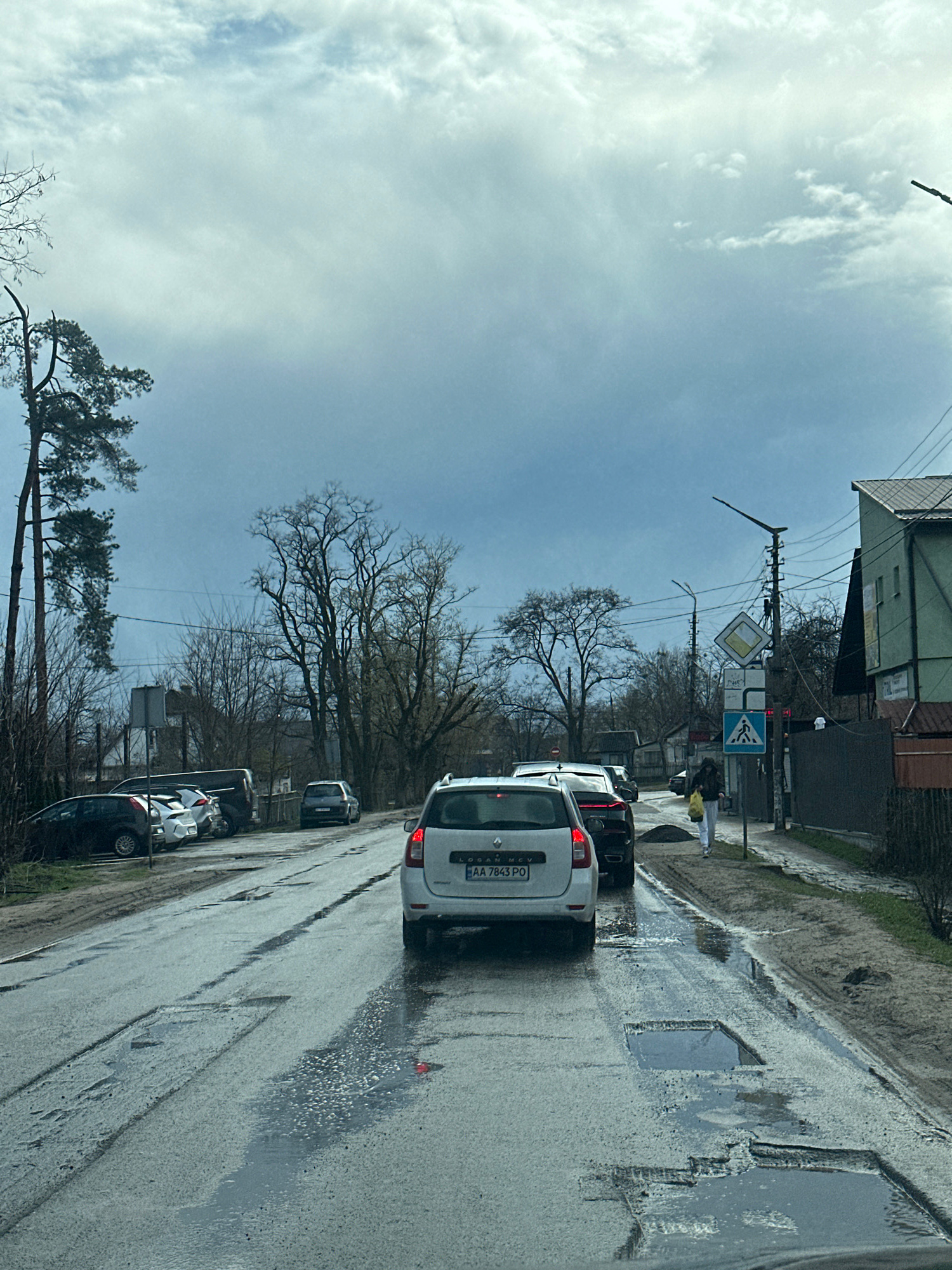 The image depicts a street scene in Irpin, Ukraine. The road is wet and appears to be in disrepair with potholes and patches. Several cars are traveling or parked along the road. A white car with lice…read more