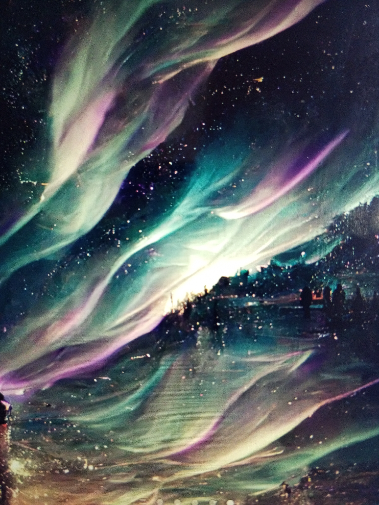 This media file captures a vibrant and ethereal night scene, featuring a spectacular display of atmospheric lights resembling an aurora borealis over a city or town. The sky is dominated by sweeping,…read more