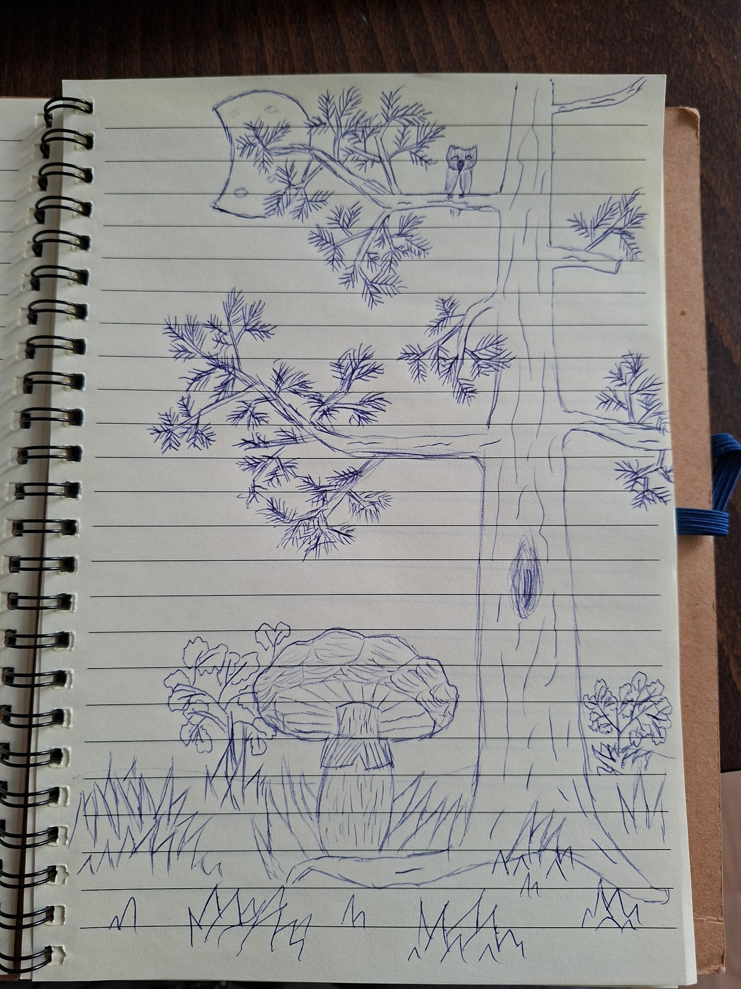 The image is a sketch in blue ink on a lined notebook page. The sketch depicts a fallen tree trunk oriented horizontally across the page. The tree trunk features several branches with pine-like needle…read more