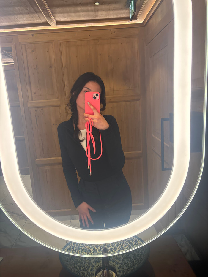 A female individual is depicted in a mirror selfie taken within an indoor facility in St. Christoph, Austria, likely a restroom or changing area. The subject has dark hair and is wearing a black long-…read more
