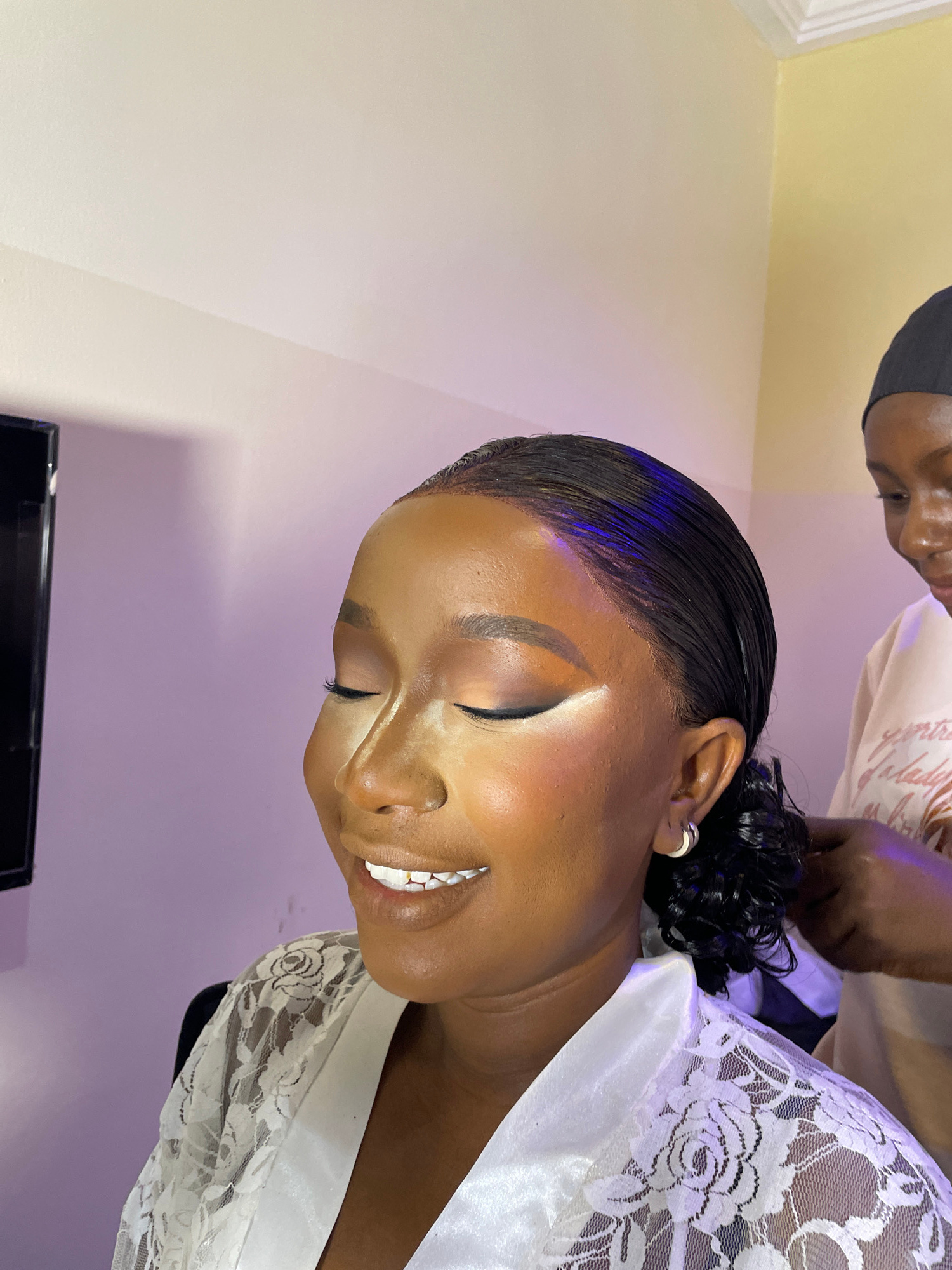A close-up, slightly angled view of a woman in a white lace robe receiving hair styling assistance. The woman, with her eyes closed, has dark, slicked-back hair with curls in the back. Her skin is bro…read more
