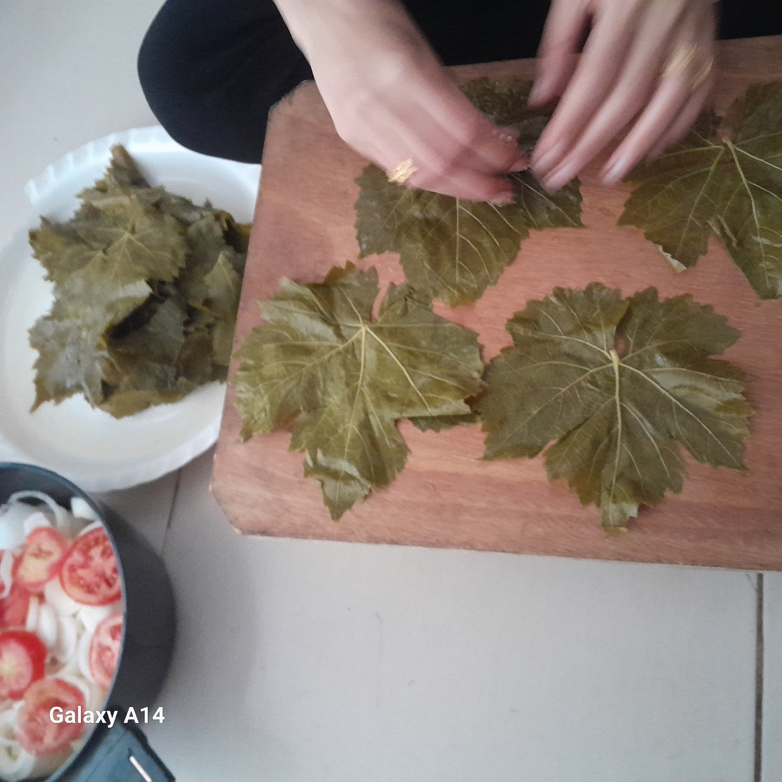 The image shows a person preparing dolma, also known as stuffed grape leaves. The scene is a close-up shot, likely taken indoors on a light-colored surface, possibly a countertop or table. The person…read more