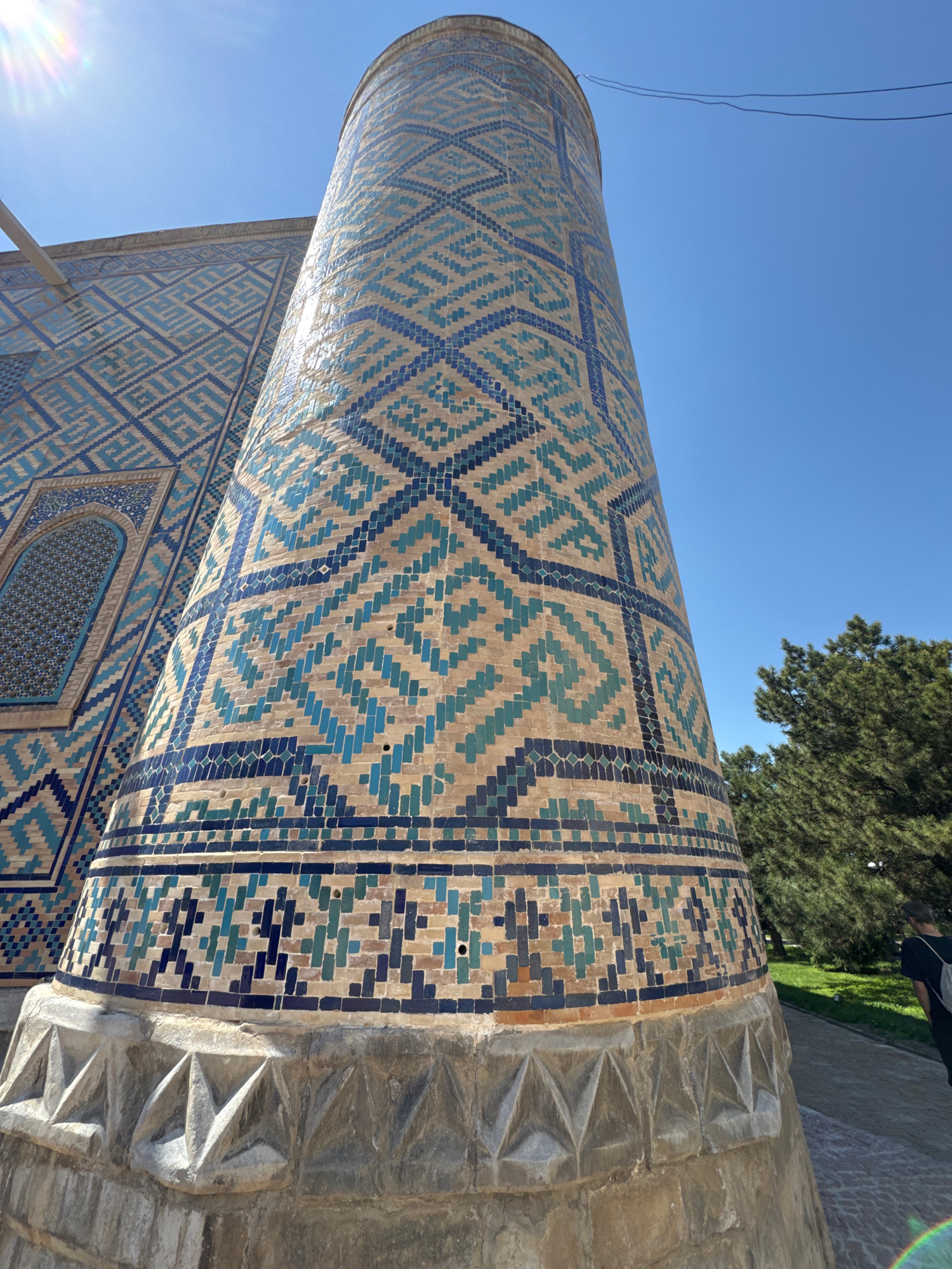 The image depicts a portion of the exterior of the Gur-e-Amir mausoleum in Samarkand, Uzbekistan. The focus is on a cylindrical column or minaret adorned with intricate mosaic tilework in shades of bl…read more