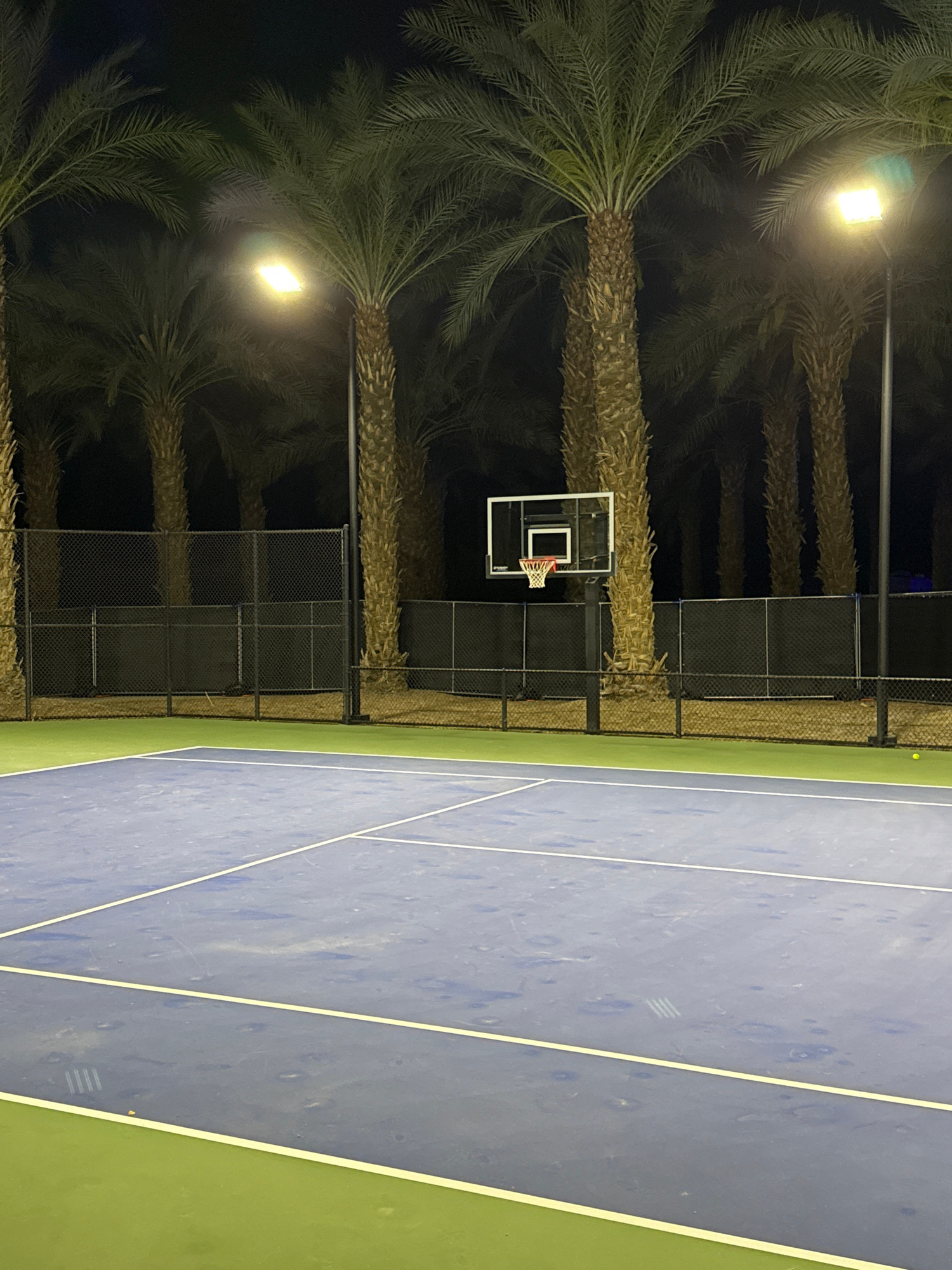 The image shows an outdoor basketball court adjacent to a tennis court, lit by overhead lights at night. The courts are surrounded by a chain-link fence, with palm trees lining the perimeter. The bask…read more