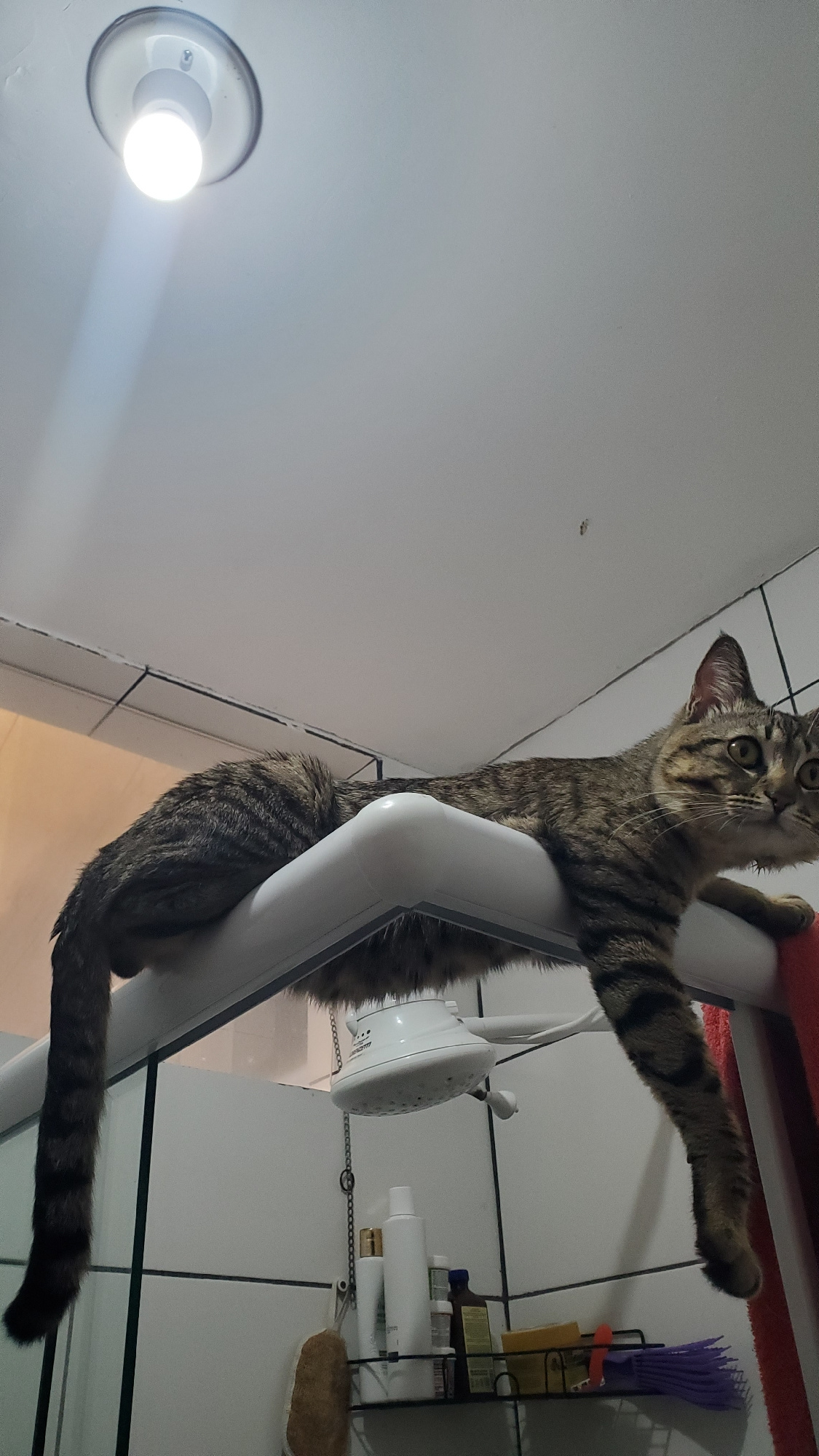 A low-angle shot depicts a brown tabby cat perched precariously on a white, angled shower grab bar in a bathroom. The bathroom has white tiled walls. Above and to the left, a light bulb is visible in…read more