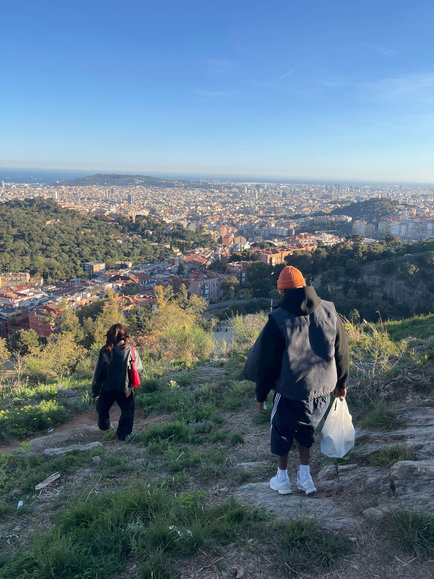 The image presents a view of Barcelona, Spain, from an elevated position. A person wearing a black jacket, orange beanie, black shorts with white stripes, and white shoes is standing on the edge of th…read more