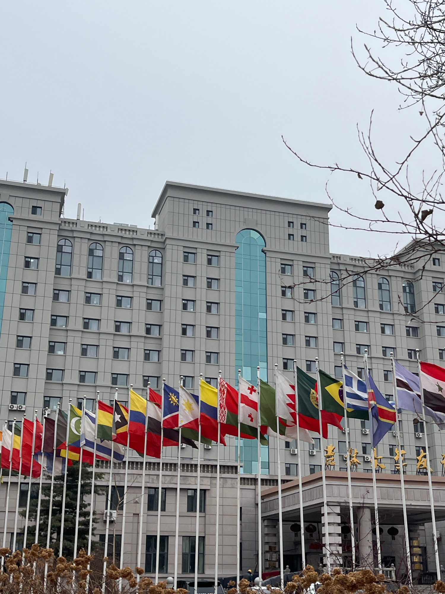 The image shows a tall, grey, rectangular building in Changchun City, China. The building has multiple rows of windows, and a section with light blue glass. A series of flagpoles with various internat…read more