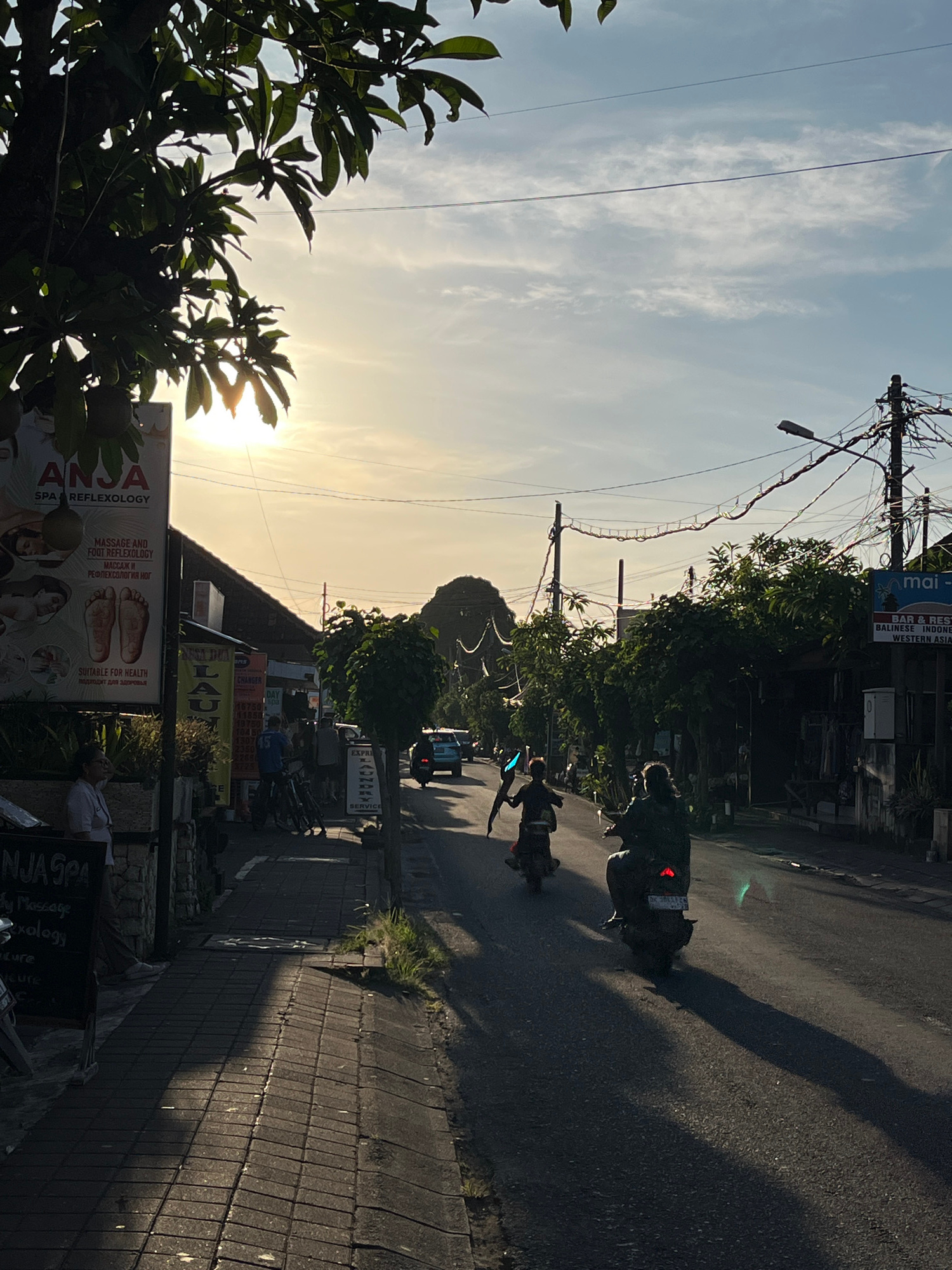 The image depicts a lively street scene in Kuta Selatan, Indonesia, bathed in the warm, golden light of either early morning or late afternoon, as suggested by the low sun casting prominent, elongated…read more