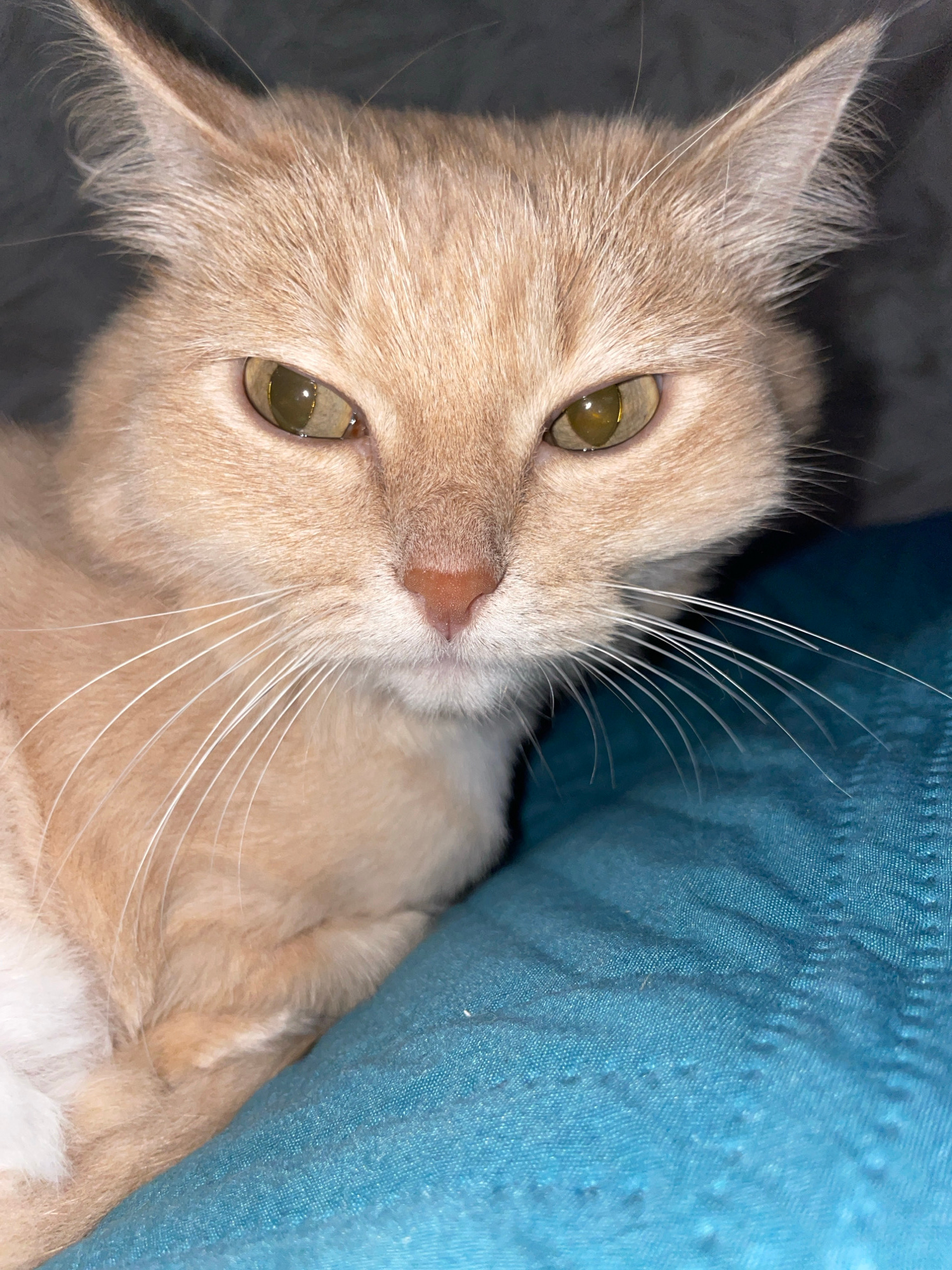 A close-up shot shows a light orange cat with green eyes and white whiskers. The cat is lying on what appears to be dark grey bedding, with a blue pillow partially visible behind it. No people or indi…read more