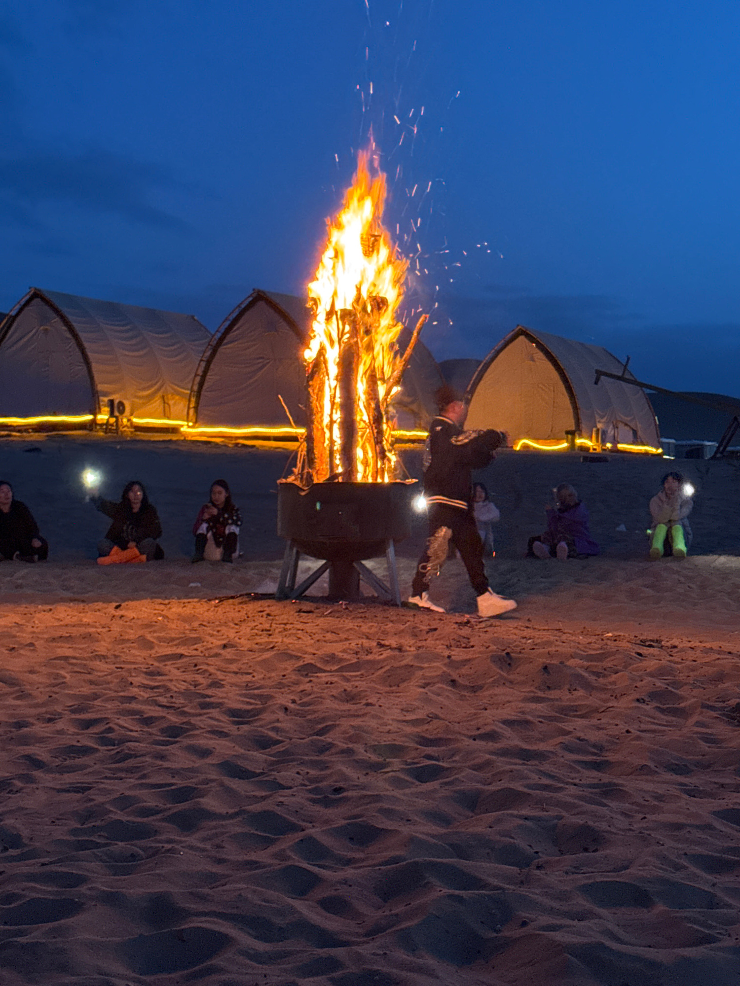 The image captures a nighttime scene on a sandy terrain, possibly a desert or beach in Dunhuang City, China, given the subject and context. A large bonfire is the focal point, with flames reaching hig…read more
