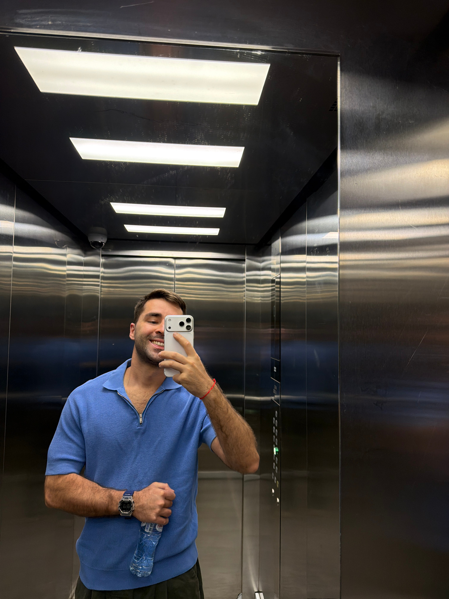 A man is taking a selfie inside an elevator. He is wearing a blue short-sleeved polo shirt, dark pants, and a watch. He is holding a water bottle in one hand and a smartphone in the other. The elevatoβ¦read more