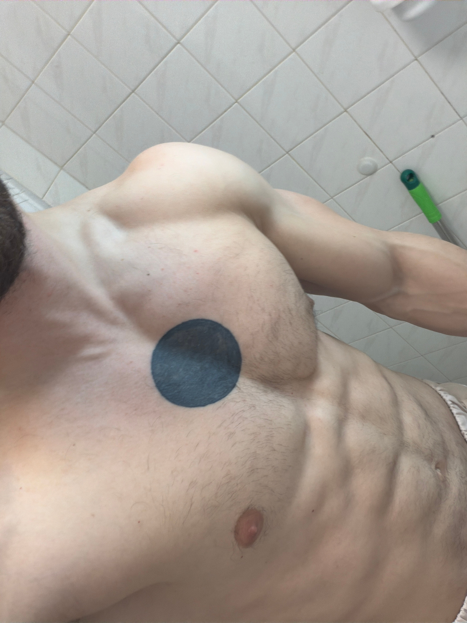 A high-angle photograph depicts a muscular, shirtless torso against a background of white, square floor tiles. A circular, dark blue tattoo is visible on the upper left chest. A green-handled cleaning…read more