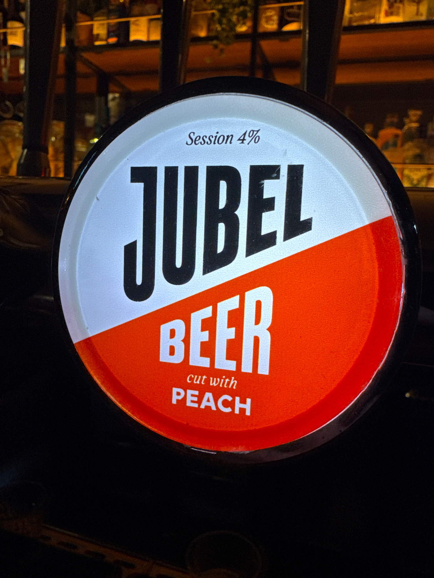 The image shows a Jubel beer tap handle in a dimly lit pub setting, likely in London, United Kingdom. The tap handle is circular, split diagonally into white and orange sections. "JUBEL" is vertically…read more