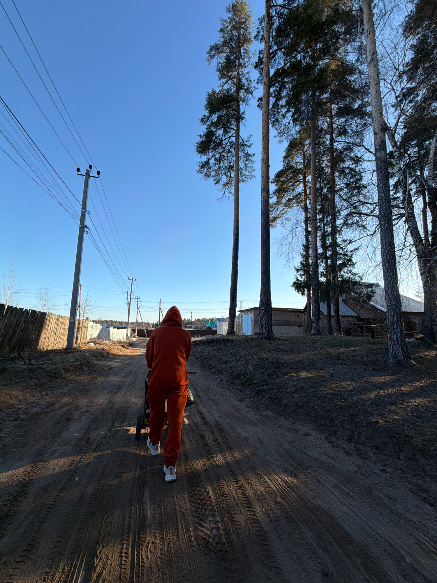 The image captures a rural or semi-rural scene along a dirt road in Chaikovsky, Russia, under a clear, bright blue sky. The perspective is from slightly behind a person, looking down the road into theβ¦read more